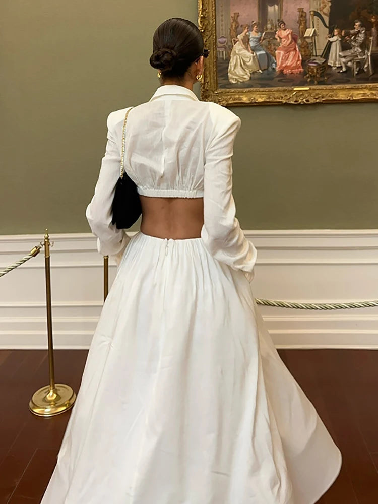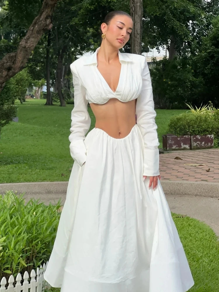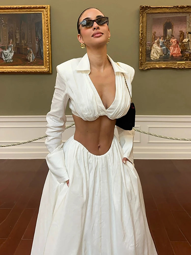 Turn heads with bold sophistication. The Trend4us Modern Sculpted Two-Piece Set pairs sharp tailoring with fluid movement for a look that blends high-fashion structure and feminine elegance. Featuring a cropped blazer-style top with strong shoulders and a deep, contoured neckline, this set sculpts the waist while highlighting the natural silhouette. The skirt offers striking volume and graceful flow, designed with a gathered high waist that flatters from every angle.