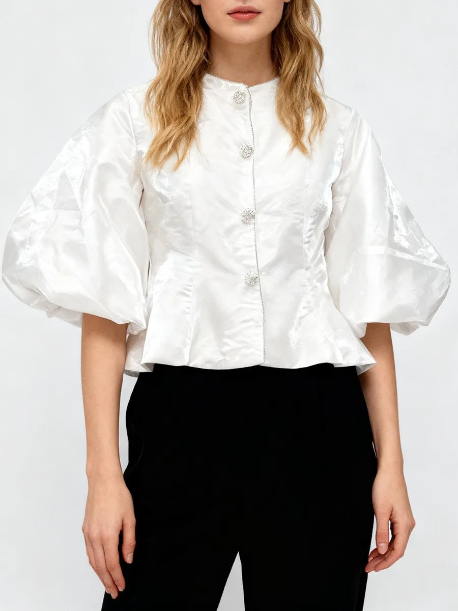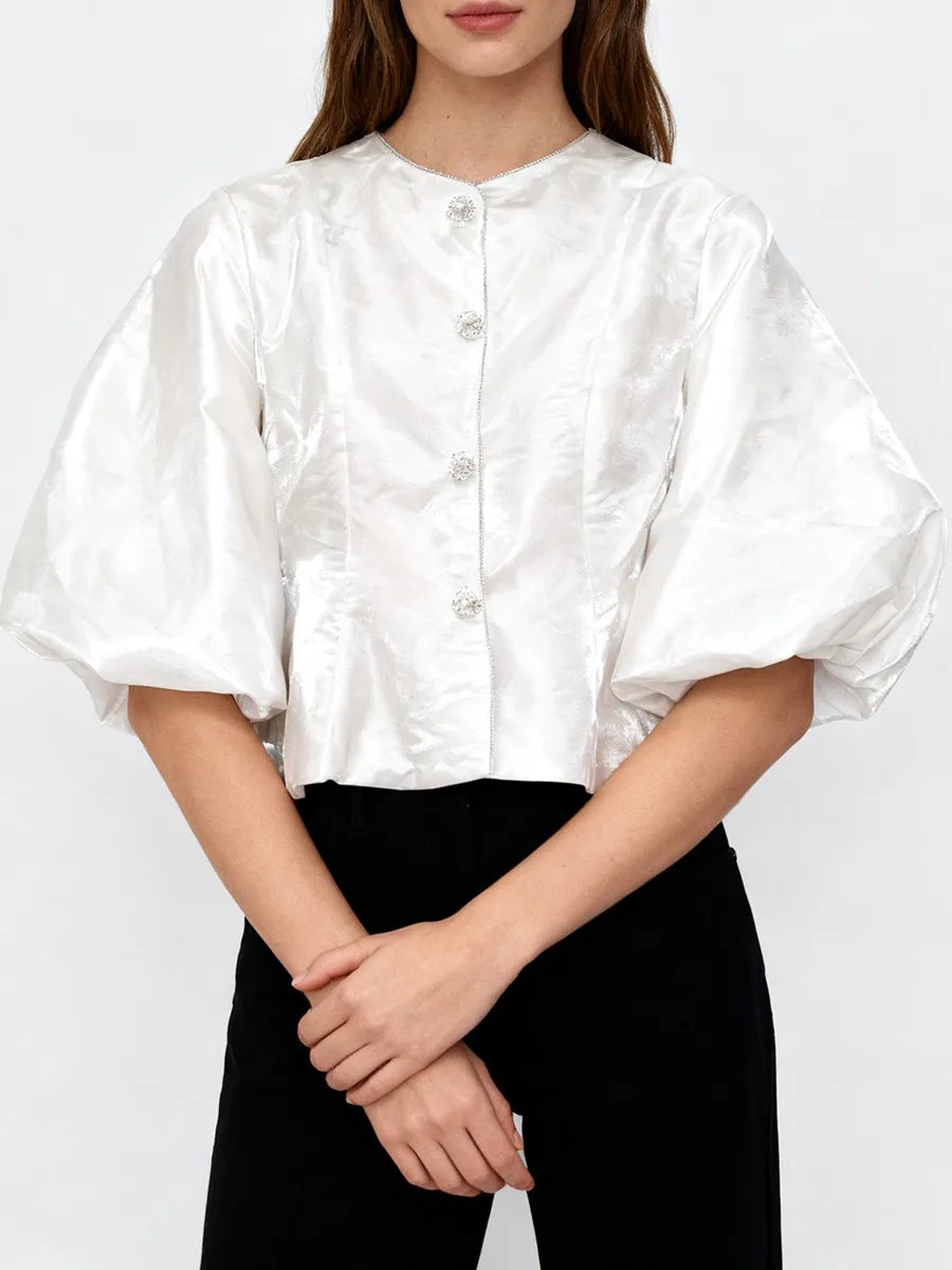 Trend4us Pearl-Button Puff Sleeve Satin Blouse