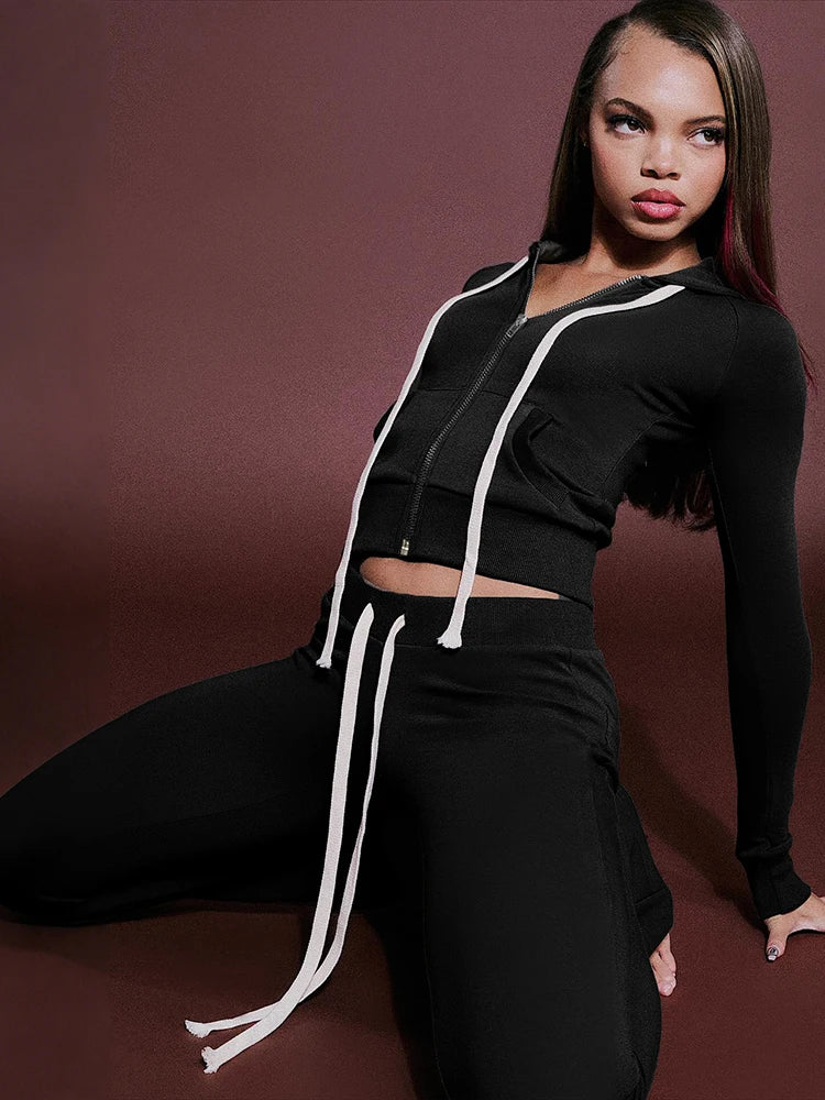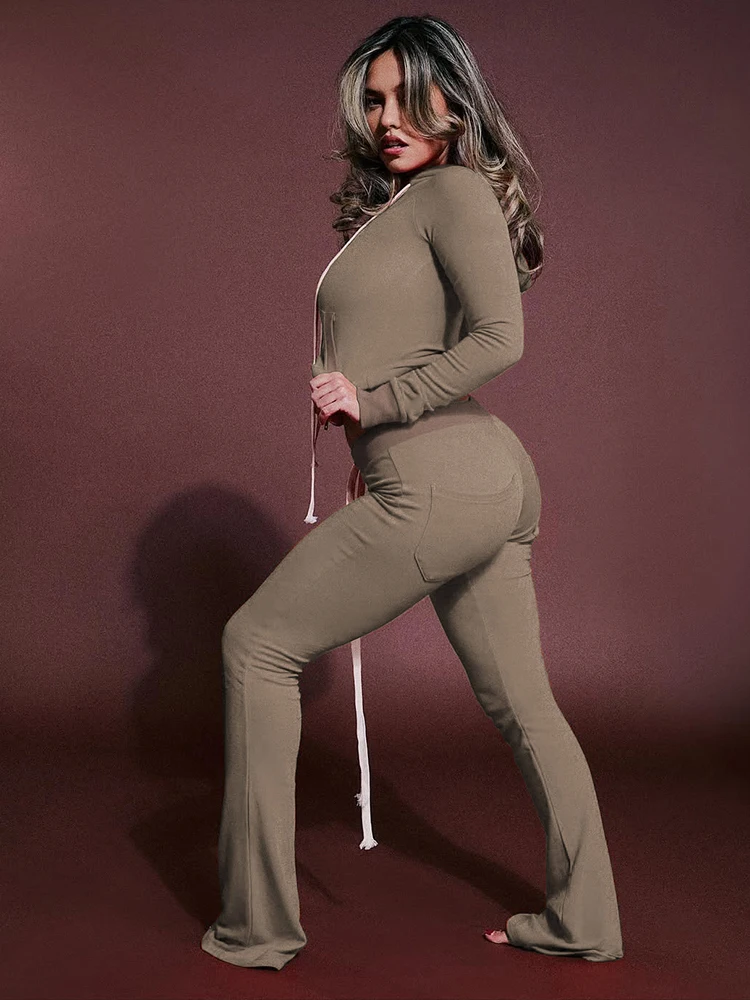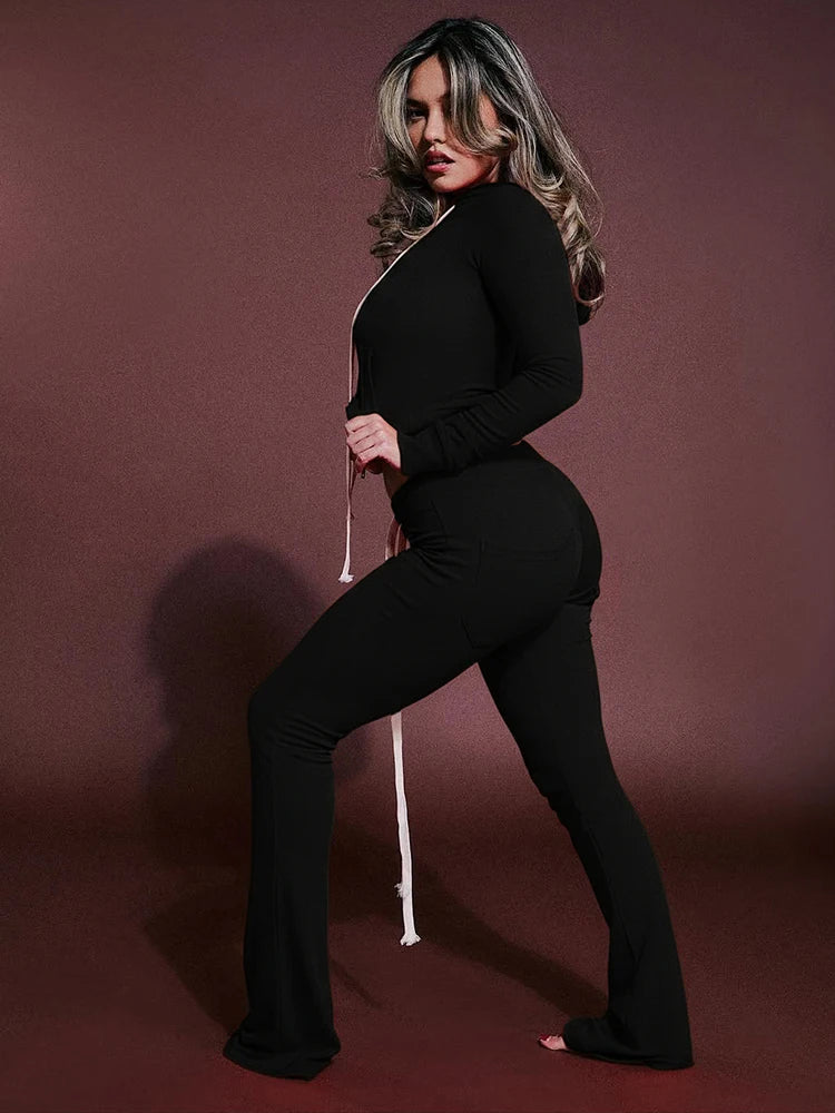 Meet your new favorite off-duty essential — the Trend4us Sleek Hooded Zip-Up Flare Lounge Set. Designed with a smooth, stretchy fabric that snatches the waist and enhances natural curves, this set blends comfort with fierce attitude. The cropped hoodie features an adjustable drawstring and a front zipper for versatile styling, while the matching flare-leg pants elongate the silhouette for that effortlessly confident look.