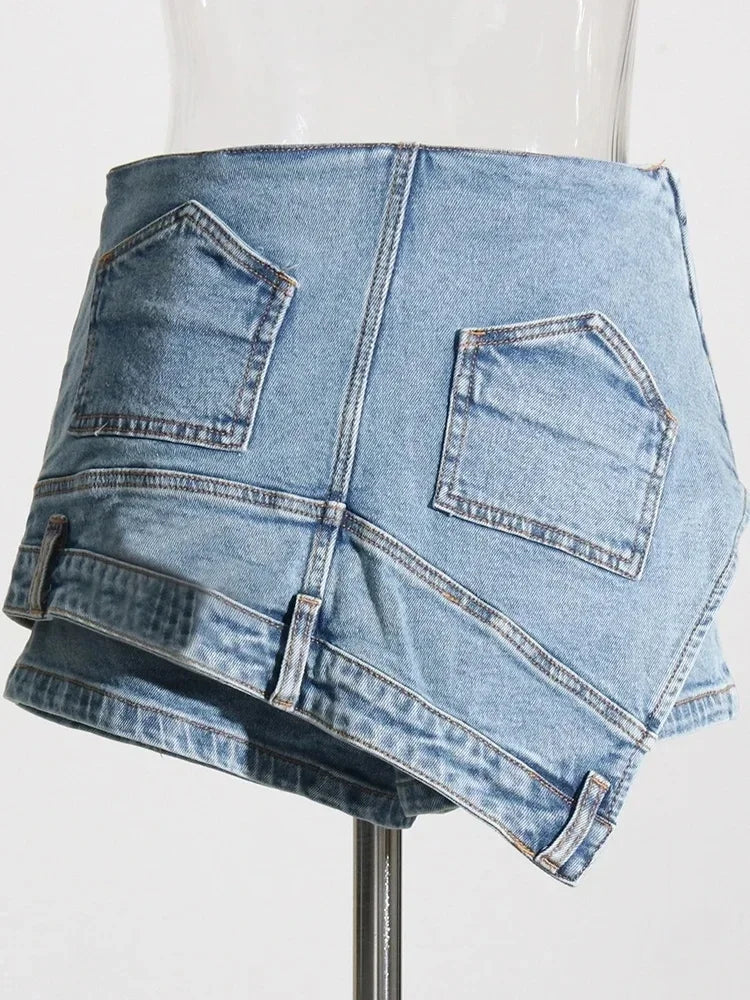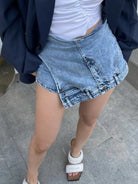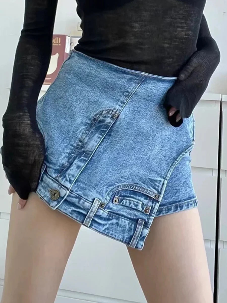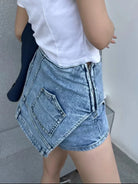 The Trend4us Asymmetric Wrap Denim Skort brings an edgy twist to everyday denim. Designed with a mini silhouette, this hybrid piece combines the bold look of a skirt with the practicality of shorts underneath. Featuring a washed denim finish, raw-edge asymmetrical overlay, and exposed seam detailing, it's a standout style perfect for streetwear, festivals, or casual statement looks.