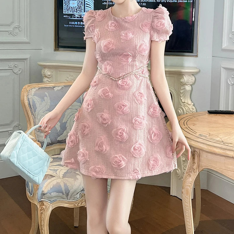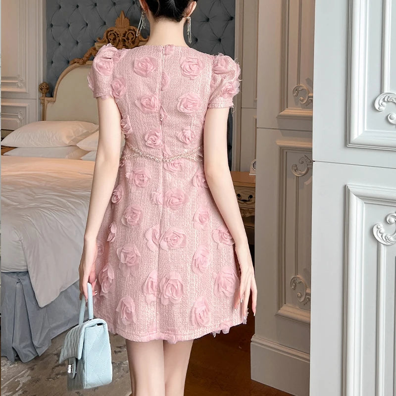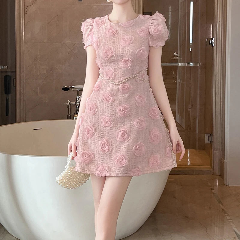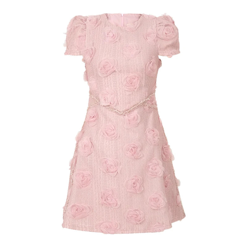 Pair this statement piece with pearl accessories and heels for an effortlessly elegant look. Make every moment magical in the Elegant 3D Rose Appliqué Puff Sleeve Mini Dress.