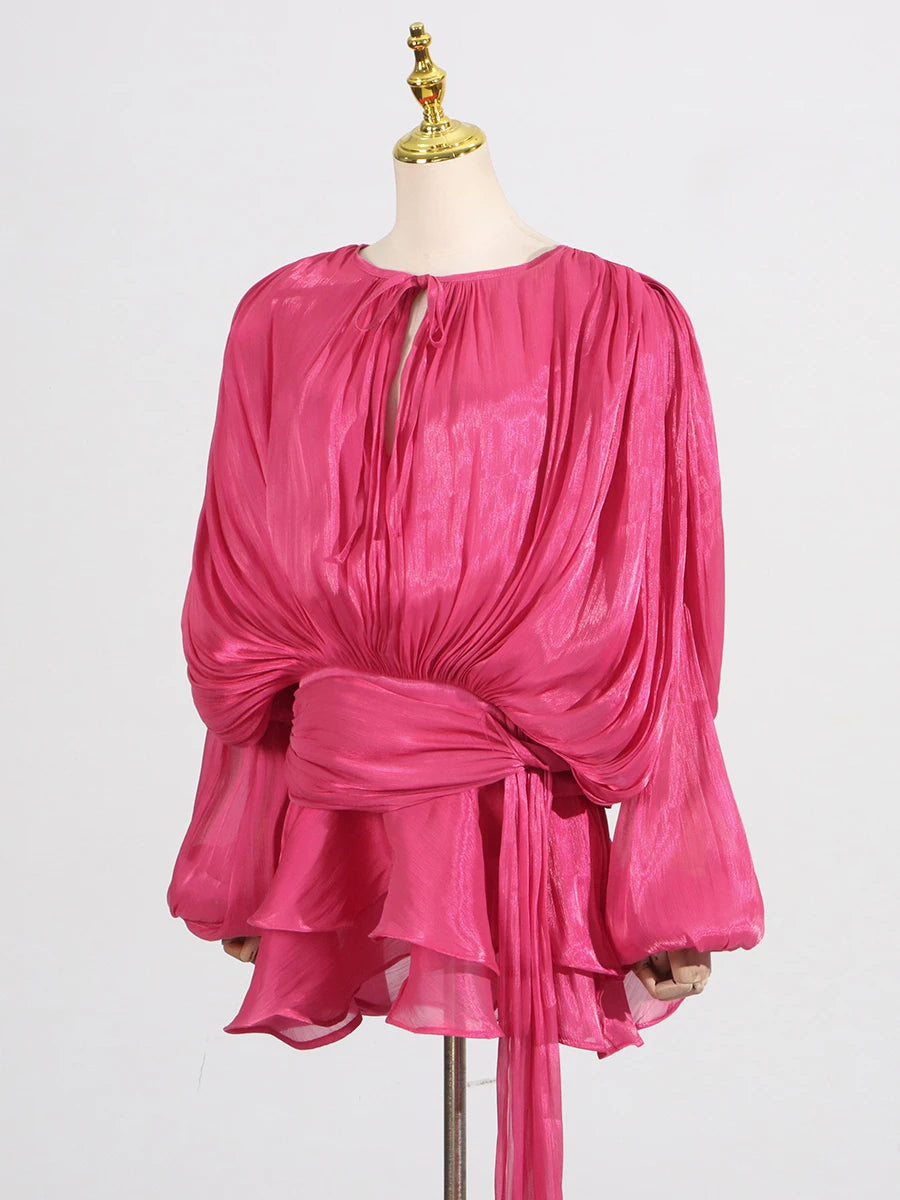 Unveil elegance with the Trend4us Luxe Draped Ruffle Tie-Neck Mini Dress, a show-stopping piece designed to turn heads. Crafted from a glossy, lightweight fabric with a subtle sheen, this dress features voluminous long sleeves, a flattering cinched waist, and cascading ruffle layers that create movement with every step. The tie-neck detail adds a touch of romantic charm, while the asymmetrical hem adds a modern edge. Perfect for evening soirées, date nights, or special occasions, this mini dress embodies effortless glamour in every shade.