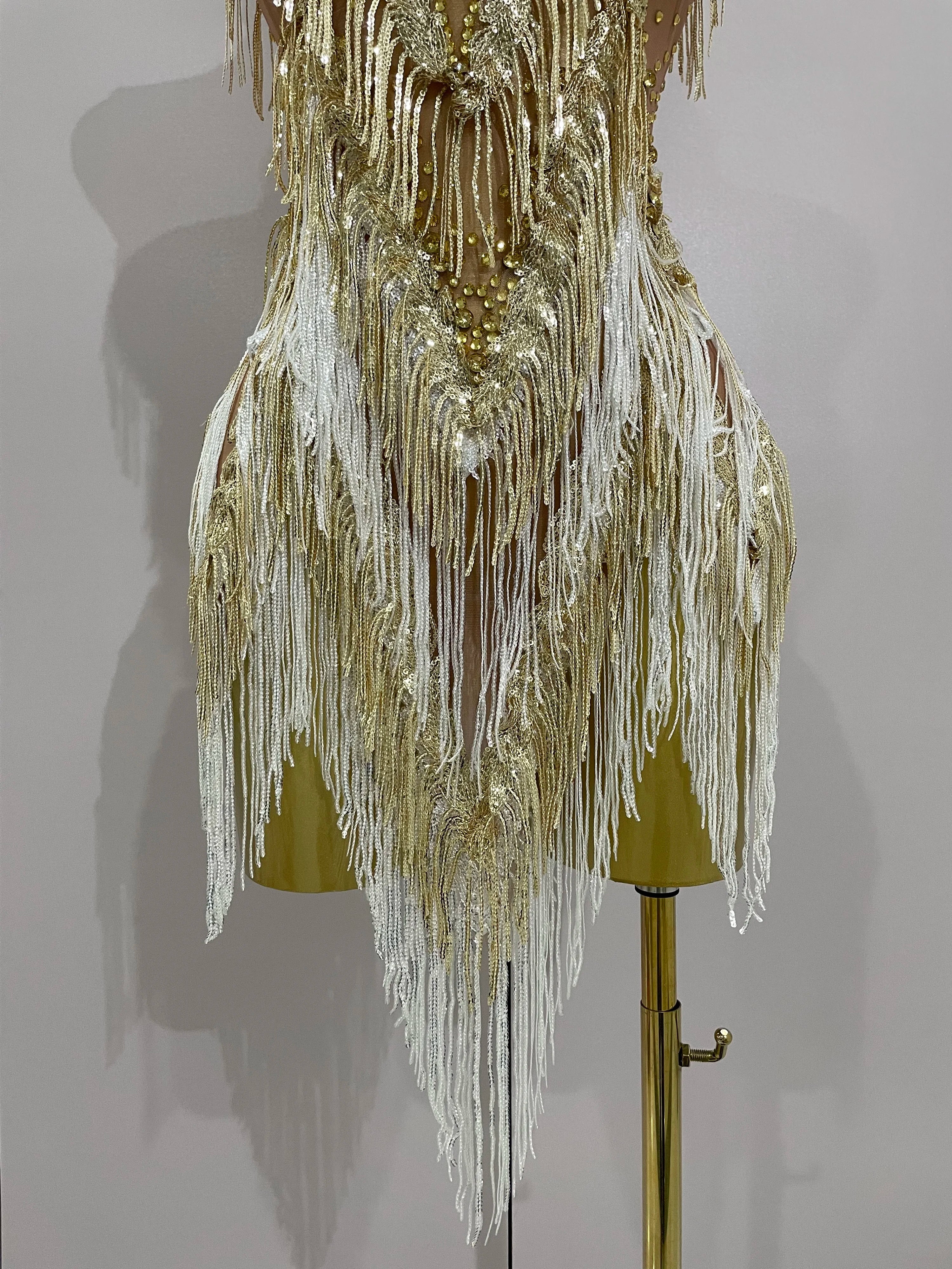 Turn heads in the Trend4us Luxe Fringe Crystal Tassel Mini Dress. Featuring a sheer nude base adorned with gold embroidery, crystal embellishments, and cascading fringe tassels, this statement piece is designed to dazzle. The high neckline and deep plunge detail add a dramatic edge, making it the perfect choice for stage, gala, or red carpet events.