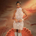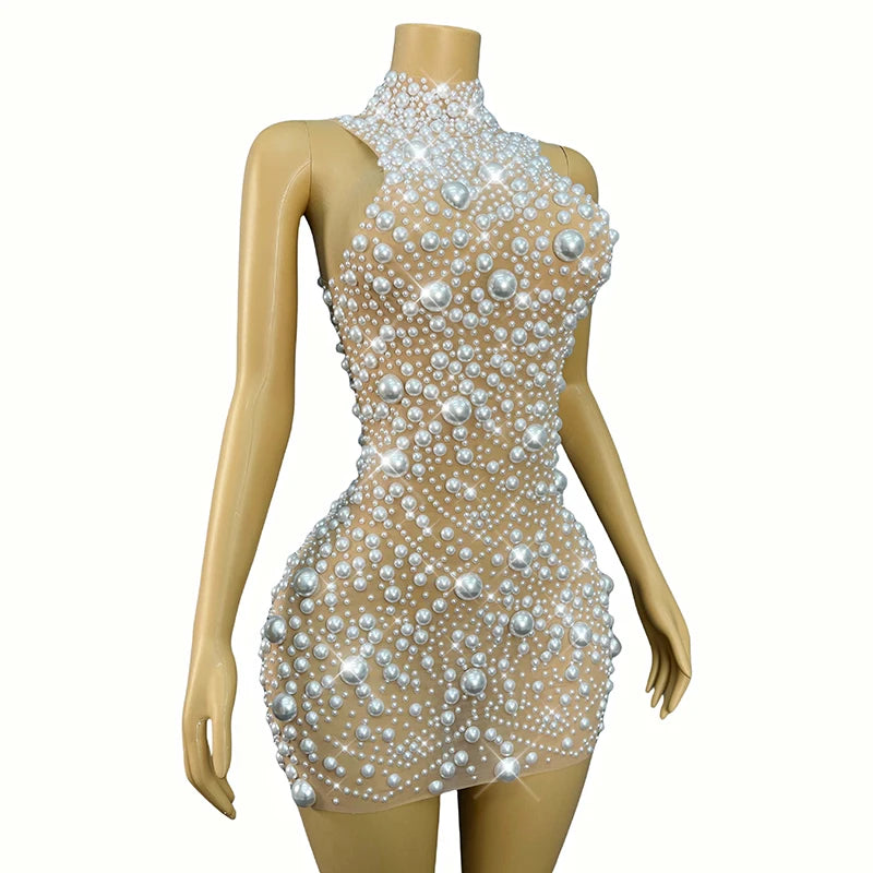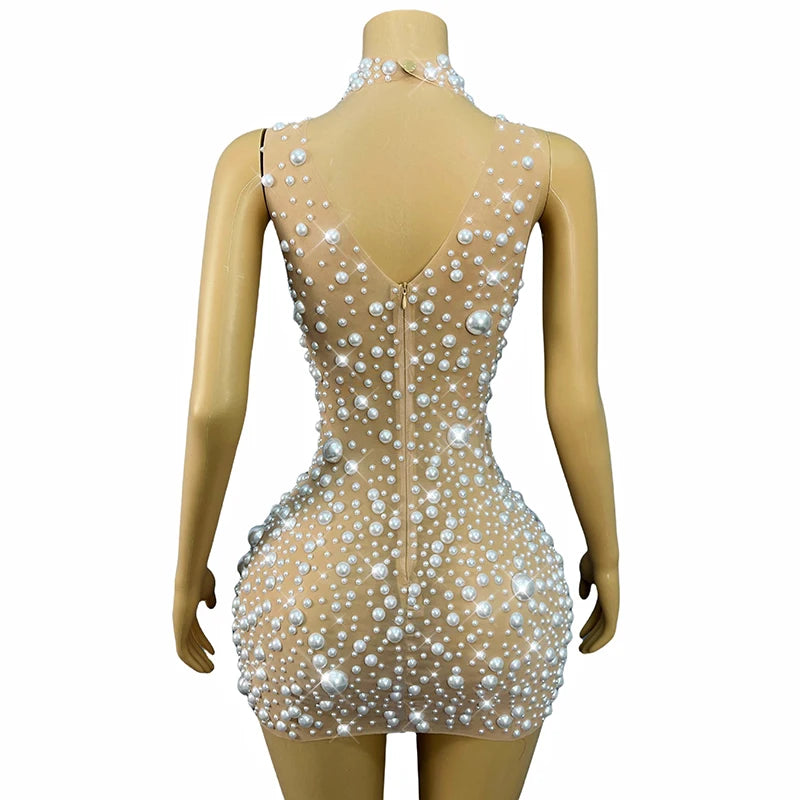 Drape yourself in elegance with the Trend4us Luxe Pearl Sheer Mini Dress — a statement piece designed to captivate. This nude illusion mesh dress features an intricate arrangement of lustrous faux pearls in varying sizes, hand-embellished across the entire silhouette. The high neckline and body-hugging fit create a graceful, polished look perfect for upscale events, galas, or red carpet moments.