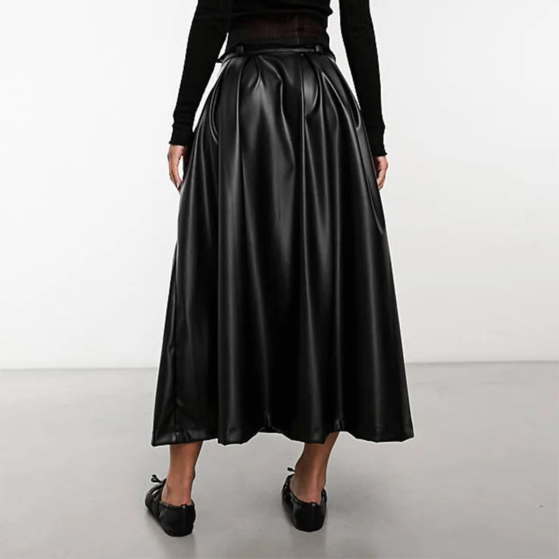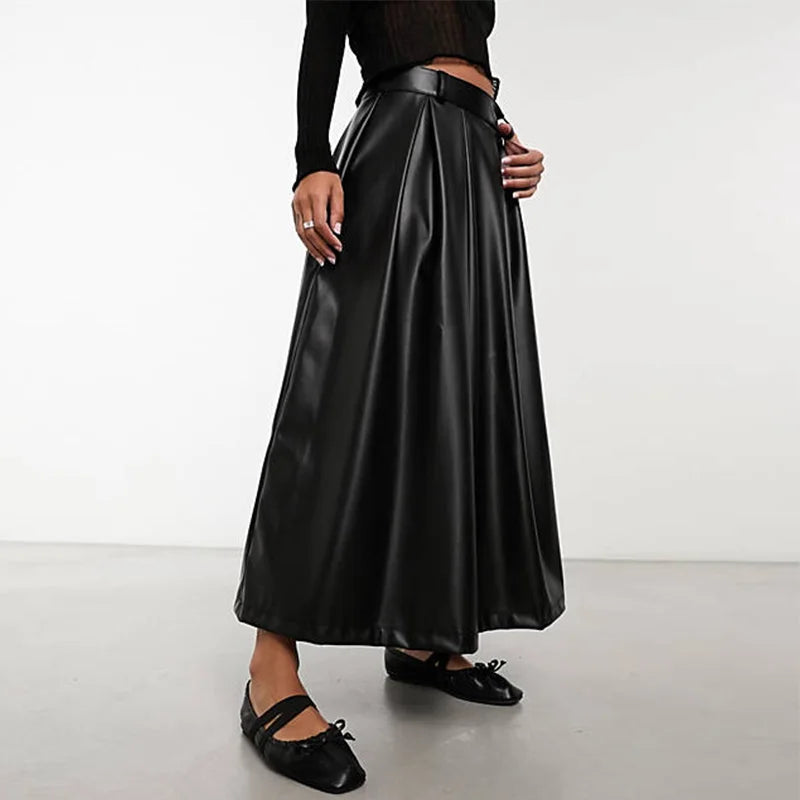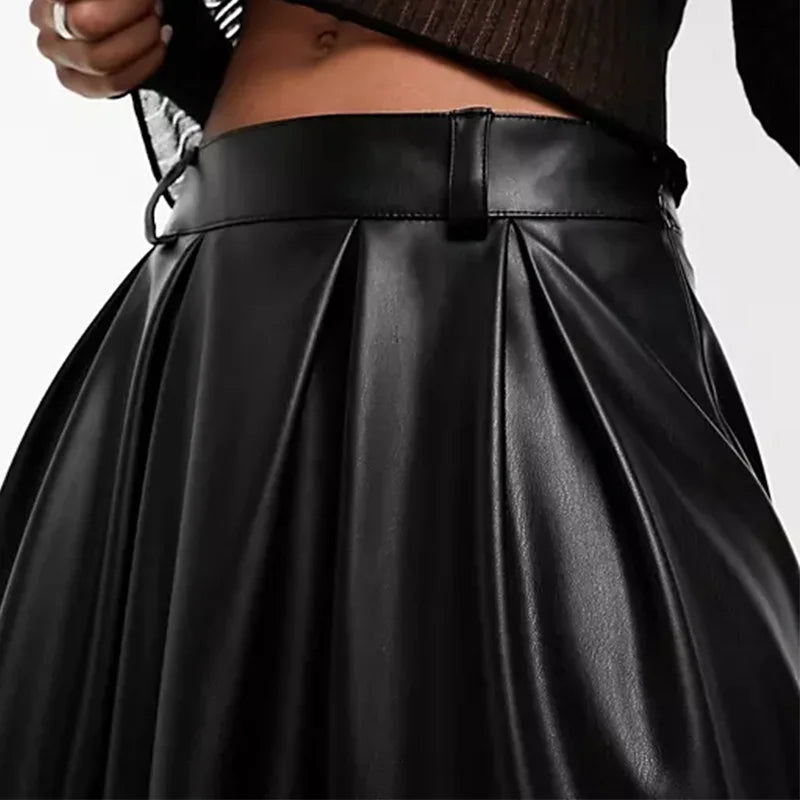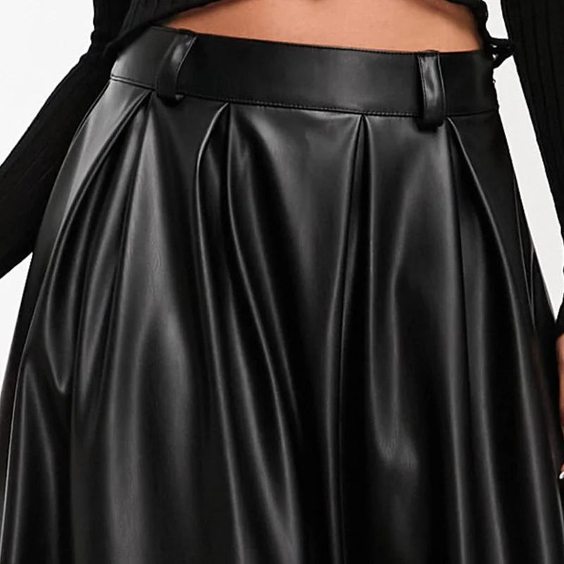 Elevate your statement wardrobe with the Trend4us Pleated Faux Leather Midi Skirt — where edgy meets elegance. Crafted from smooth, high-quality faux leather, this skirt features structured pleats that create a flowing A-line silhouette. Designed with a high-rise waist and a midi-length cut, it flatters the figure while delivering modern sophistication. Perfect for pairing with cropped knits, sheer blouses, or chunky boots, this skirt adds effortless polish to both day and night looks.