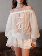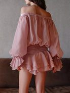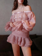 Embrace effortless elegance with the Trend4us Romantic Off-Shoulder Ruffled Mini Dress. Designed to captivate, this dreamy dress features a flattering off-the-shoulder neckline, sheer billowy sleeves, and delicate pearl-accented ribbon details. The cinched waist enhances your silhouette, while the layered ruffled skirt adds a touch of feminine charm and movement. Crafted from lightweight chiffon, this dress offers a soft, airy feel, making it perfect for romantic evenings, cocktail parties, or any special occasion where you want to make a statement.
