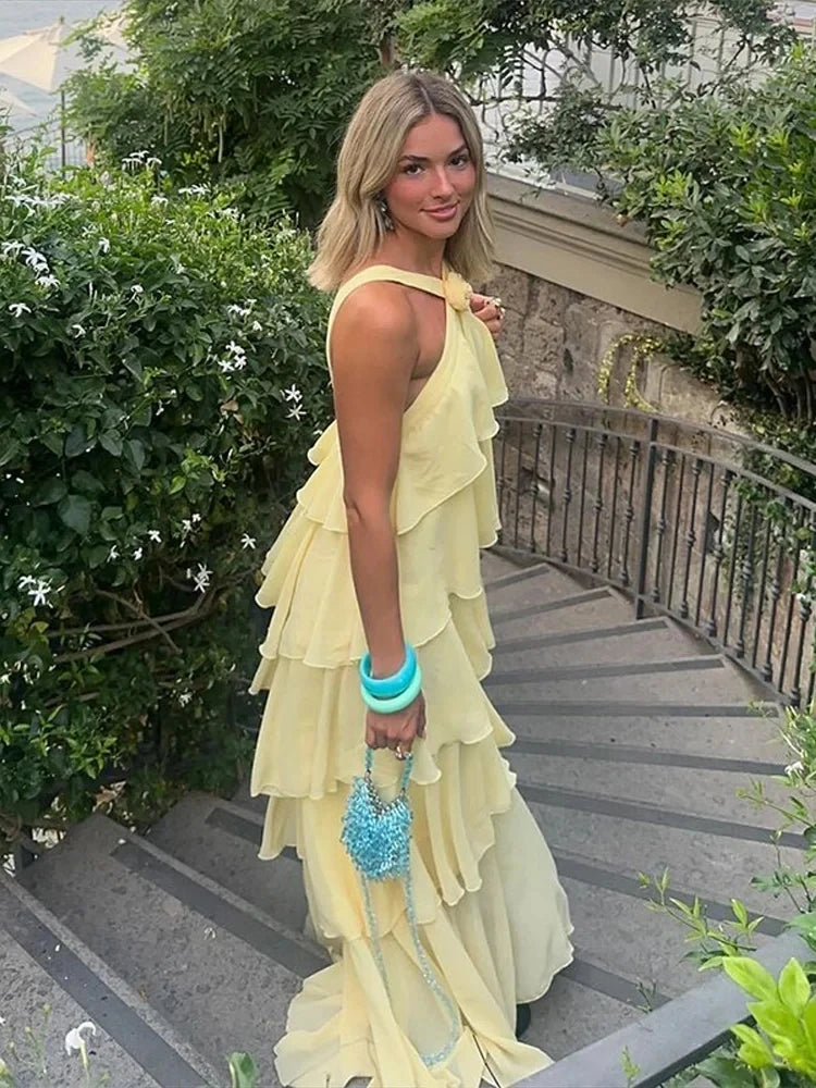 Embrace effortless elegance with the Trend4us Ruffled Halter Layered Chiffon Maxi Dress. Designed with cascading ruffle tiers and a graceful halter neckline, this flowy maxi dress offers a romantic and airy silhouette. The soft chiffon fabric drapes beautifully, perfect for garden parties, vacation evenings, or daytime weddings. Its backless detail and layered movement give it a breezy, ethereal charm.