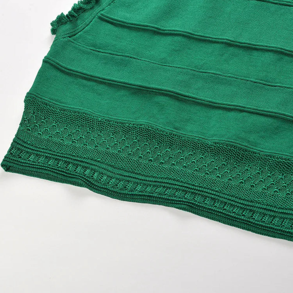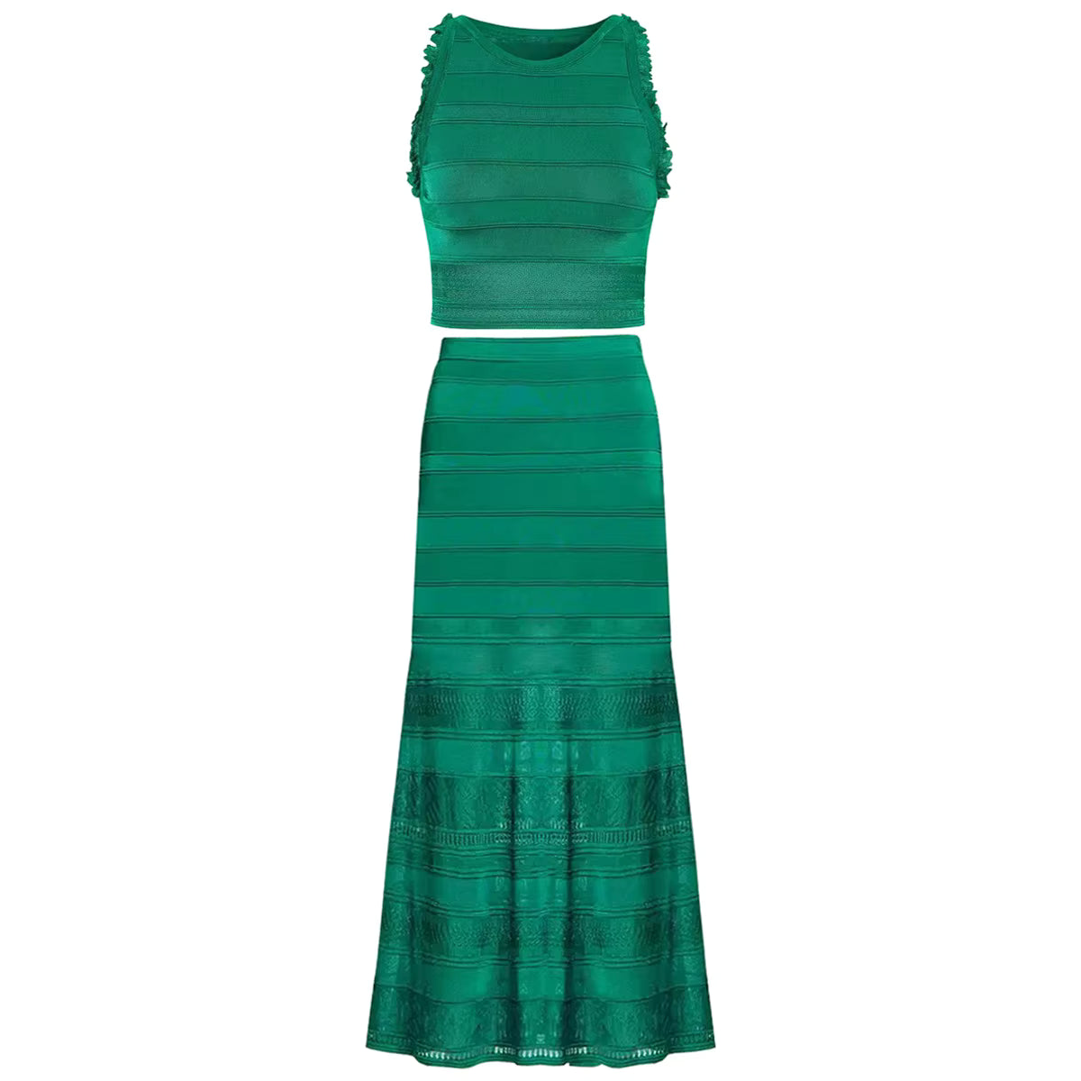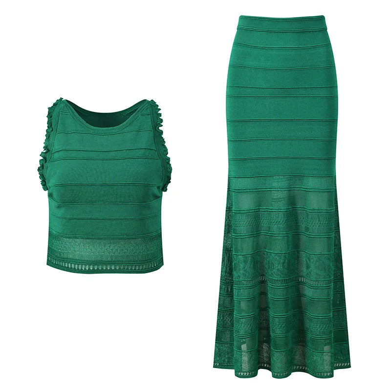 Elevate your wardrobe with the Trend4us Vintage Knit Crop Top & Skirt Set. This coordinated ensemble features a textured sleeveless crop top with subtle ruffle accents and a high-waisted mermaid-style maxi skirt. The vintage-inspired knit detailing adds timeless charm, making it perfect for both casual chic and elegant outings.