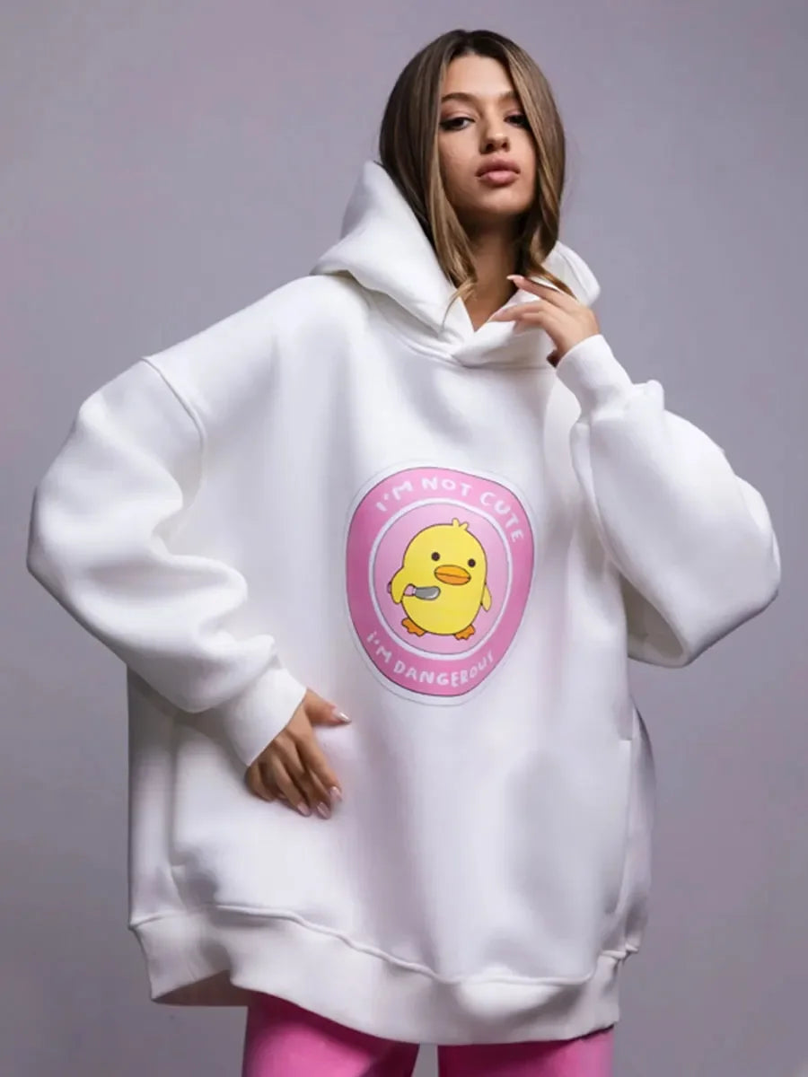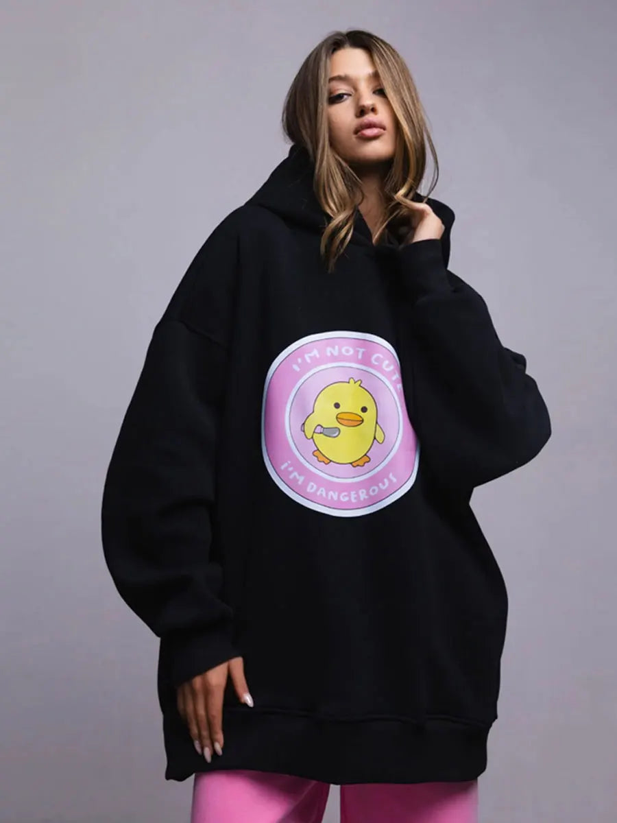 Bold energy meets cozy streetwear in the Trend4us Duck Oversized Streetwear Hoodie. Featuring a confident duck graphic with the empowering message “I’m Not Cute — I’m Dangerous!”, this hoodie brings playful attitude to an ultra-relaxed silhouette.