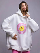 With a soft fleece interior, oversized drop shoulders, and a roomy hood, it’s the perfect piece for any casual look — from street styling to weekend lounging. Style it solo as a hoodie dress or layer it with leggings or joggers for a bold, comfy vibe.