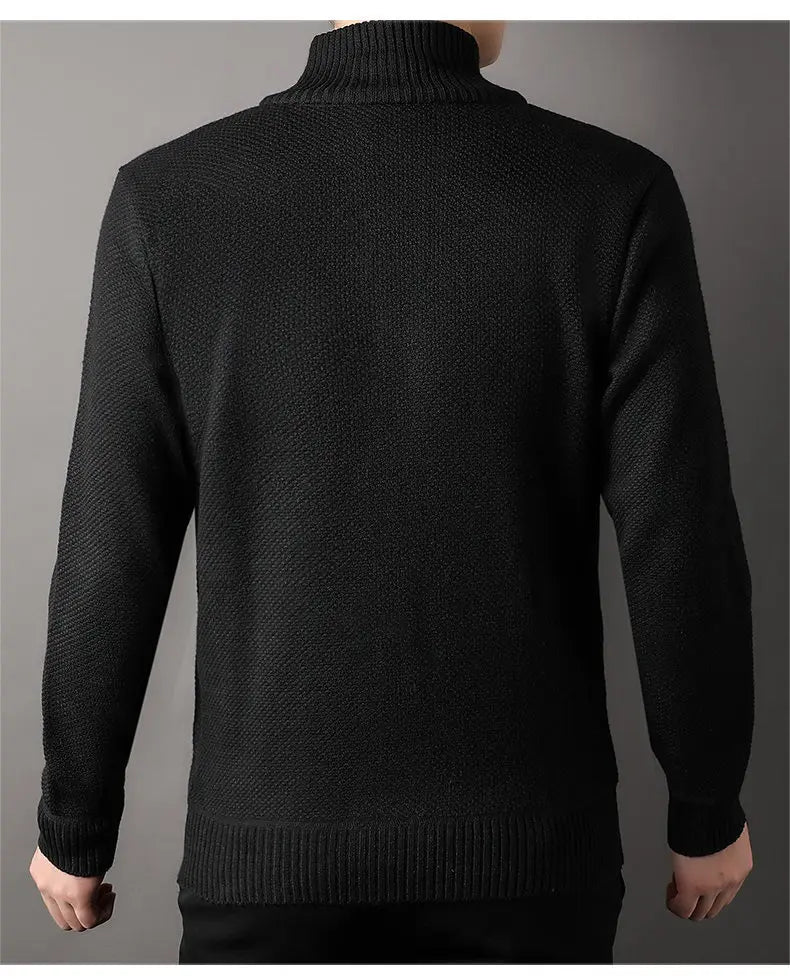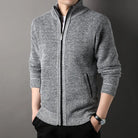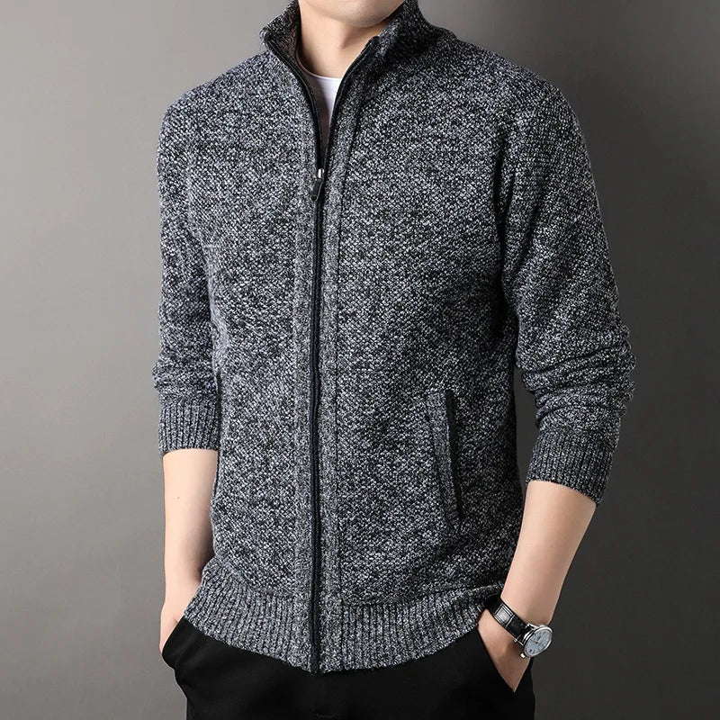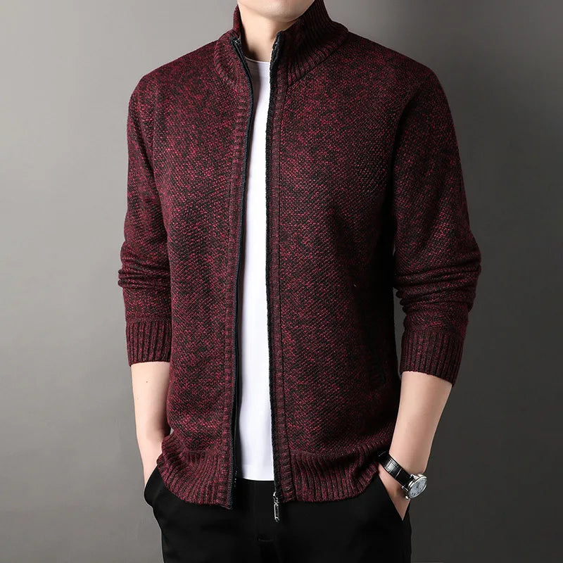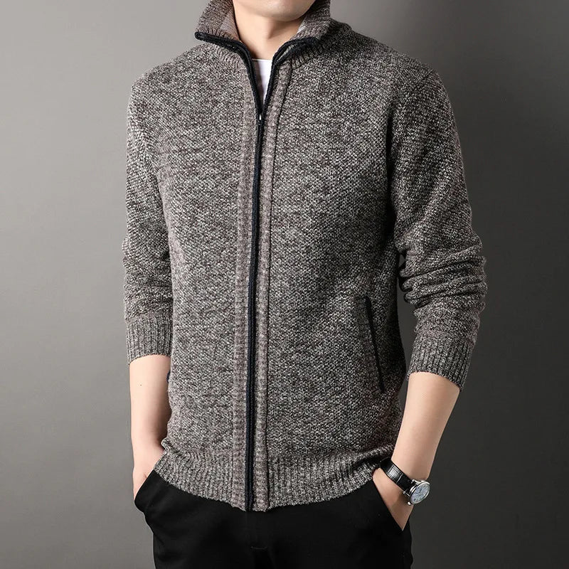 Elevate your layering game with this modern zip-up knit cardigan, designed for the contemporary man who values both style and comfort.
