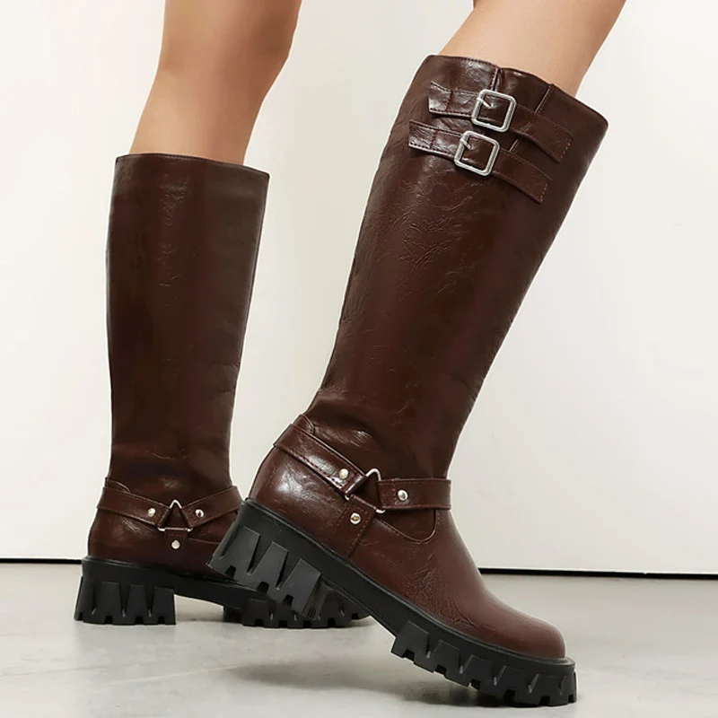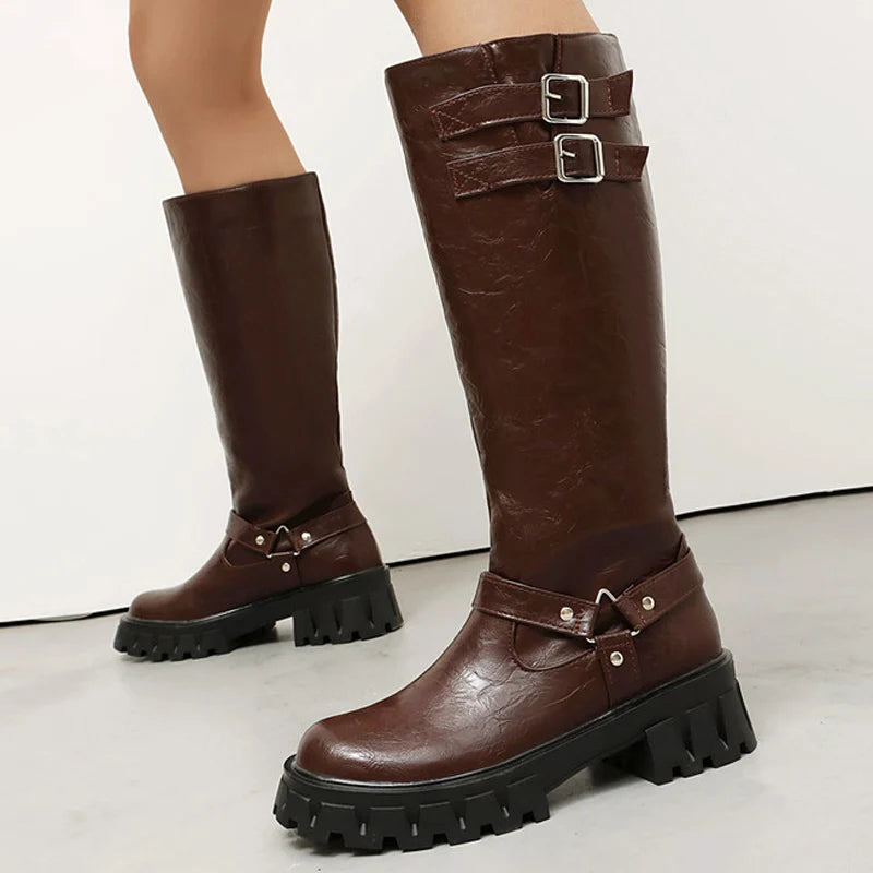 Make a bold statement with the Trend4us Buckle Strap Chunky Knee-High Boots, designed for edgy style and all-day comfort. Featuring a rugged chunky sole for maximum grip, these boots combine practicality with modern fashion. The double buckle strap detail at the shaft and ankle harness-style strap add a striking touch, while the knee-high silhouette delivers a powerful look. Perfect for streetwear, festivals, autumn-winter outfits, or any occasion where confidence meets style.