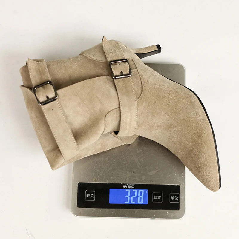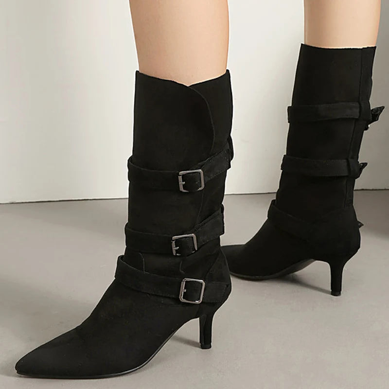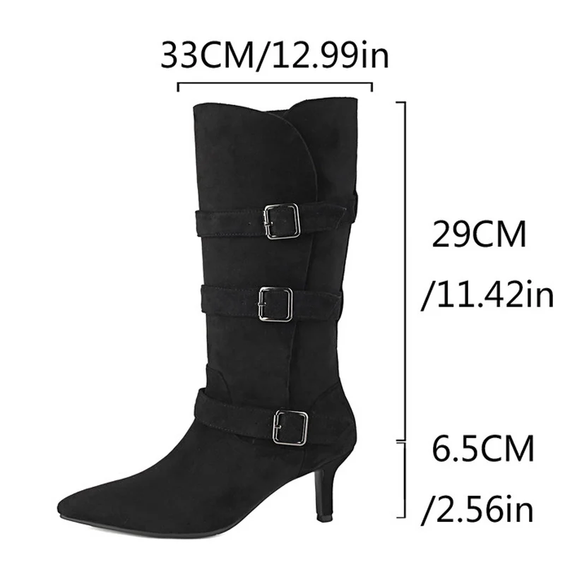 Step out in bold sophistication with the Trend4us Buckle Strap Suede Stiletto Mid-Calf Boots. Designed with a luxe suede finish, these boots feature a sleek pointed toe, slim stiletto heel, and striking multiple buckle strap accents that add an edgy-chic flair. The mid-calf length creates a versatile silhouette that pairs effortlessly with dresses, skirts, and skinny jeans, making them a go-to choice for both streetwear and evening occasions. Perfect for fashion-forward women who crave elegance with attitude.