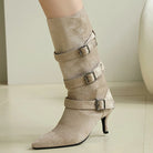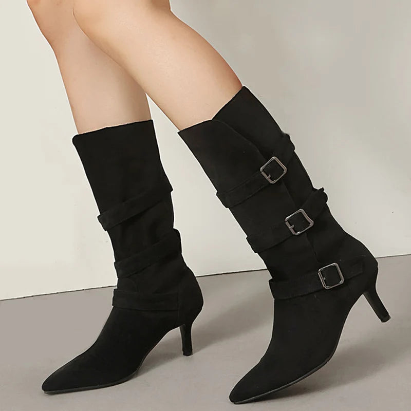 Trend4us Buckle Strap Suede Stiletto Mid-Calf Boots