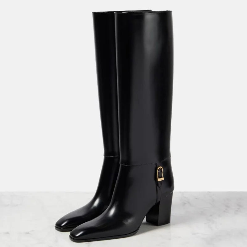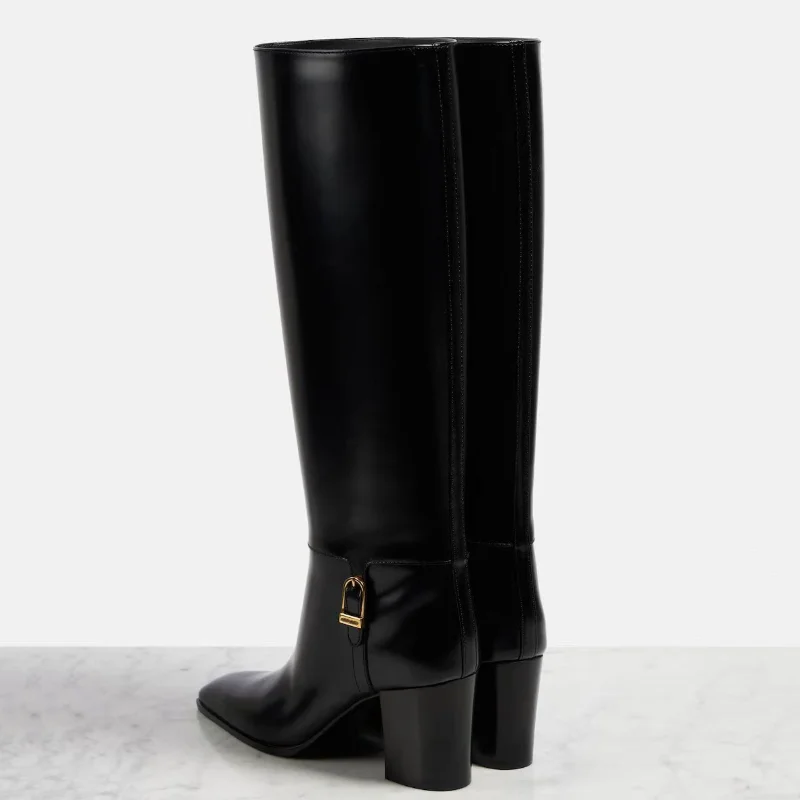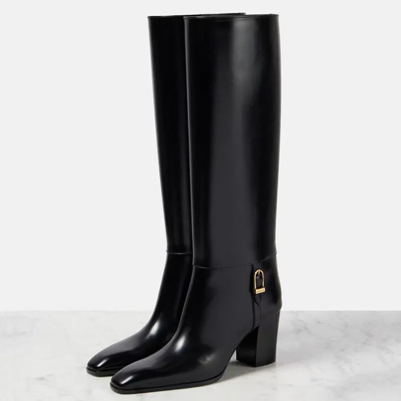 Elevate your wardrobe with the Trend4us Classic Leather Block Heel Knee-High Boots, a timeless design that blends sophistication with comfort. Crafted from premium faux leather, these sleek black boots feature a structured silhouette, a sturdy block heel, and a polished gold buckle accent at the ankle. With their versatile knee-high cut and elegant square toe, they’re perfect for pairing with dresses, skirts, or tailored trousers. Whether styled for work, evenings out, or chic winter streetwear, these boots are a must-have staple in every modern wardrobe.