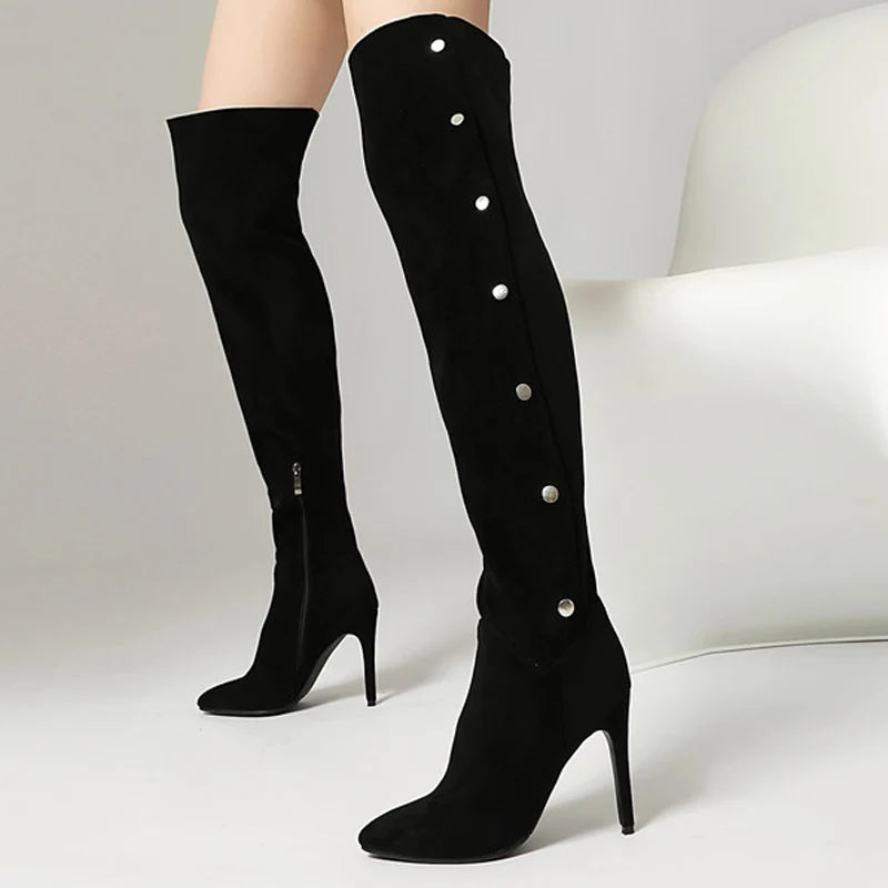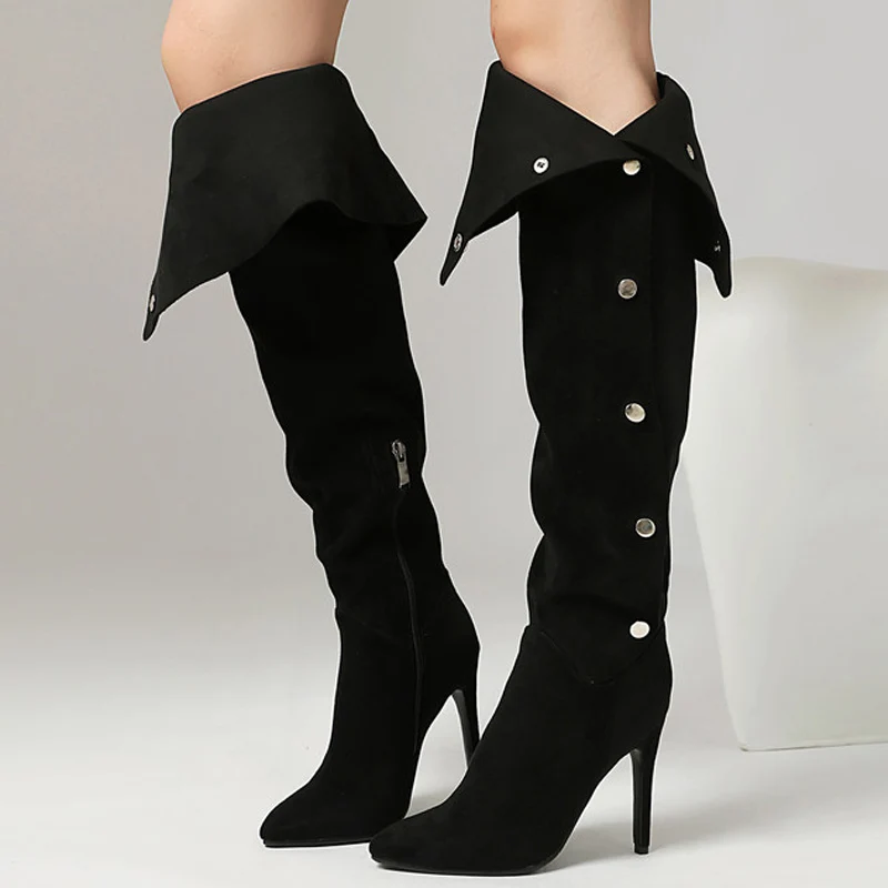 Unleash versatile elegance with the Trend4us Convertible Button Suede Stiletto Over-The-Knee Boots. Crafted from luxe suede, these boots feature a sleek pointed toe, slim stiletto heel, and chic button-down detailing along the shaft. Designed with a convertible style, they can be worn fully extended over-the-knee for a bold silhouette or slouched down for a relaxed, fashion-forward look. Perfect for day-to-night wear, these boots add a touch of modern sophistication to dresses, skirts, and skinny jeans.