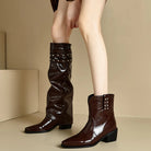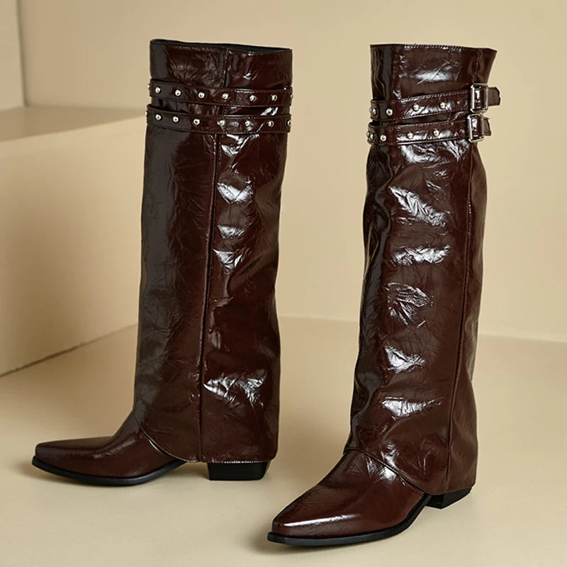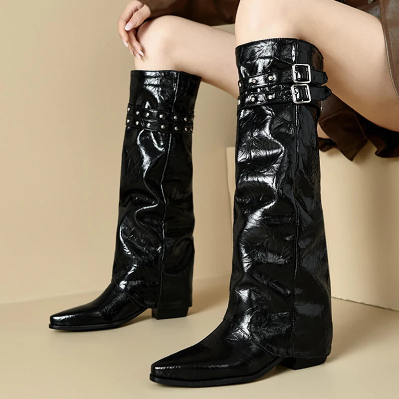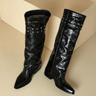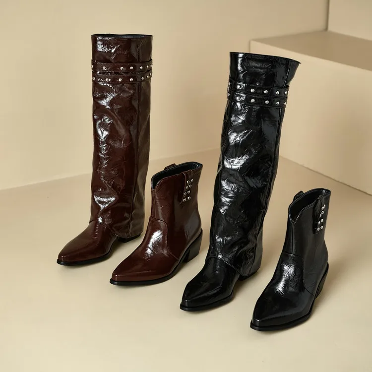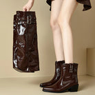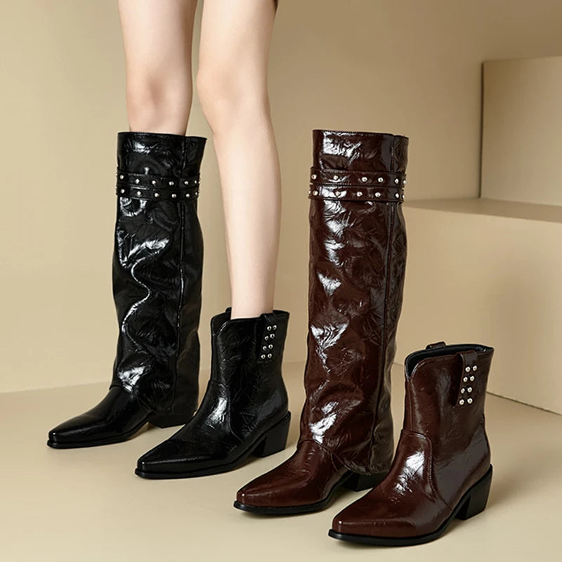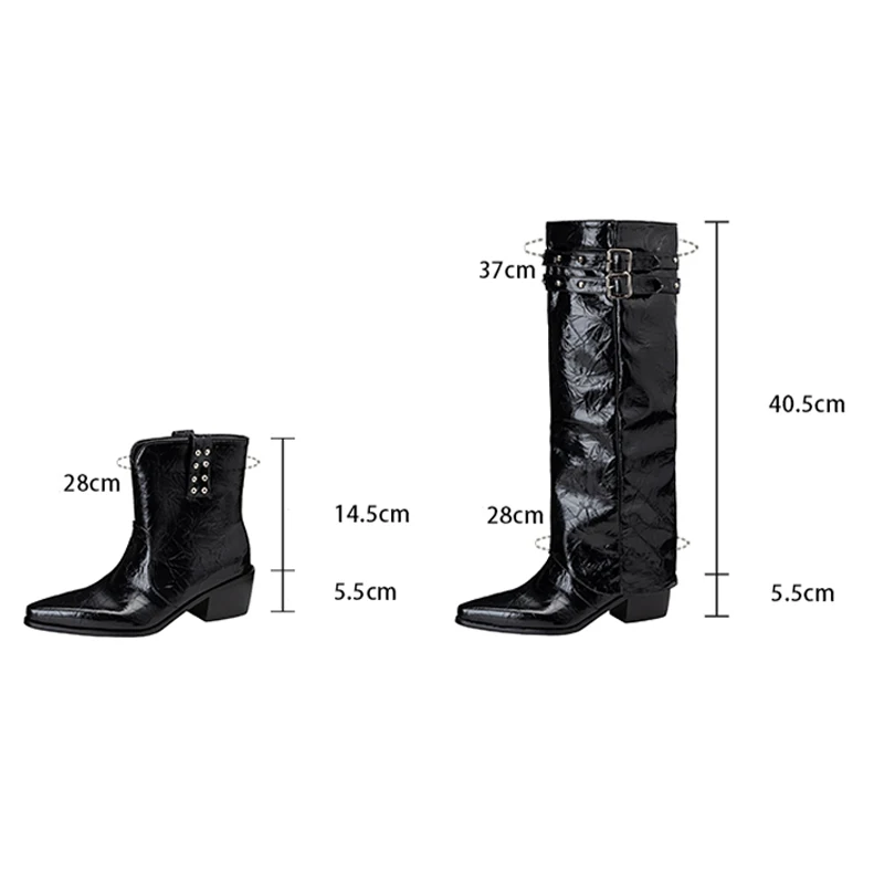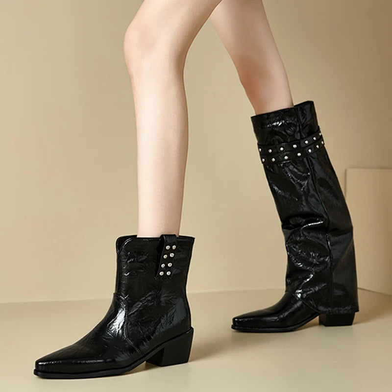 Redefine versatility with the Trend4us Convertible Studded Glossy Leather Boots, designed to transform seamlessly from chic knee-high boots to edgy ankle boots. Crafted from premium glossy faux leather with a striking studded strap detail, these boots bring bold sophistication to any look. The detachable shaft allows you to customize your style—wear them tall for sleek elegance or short for a cool, casual vibe. Finished with a comfortable block heel and pointed toe, these boots are perfect for day-to-night wear across every season.