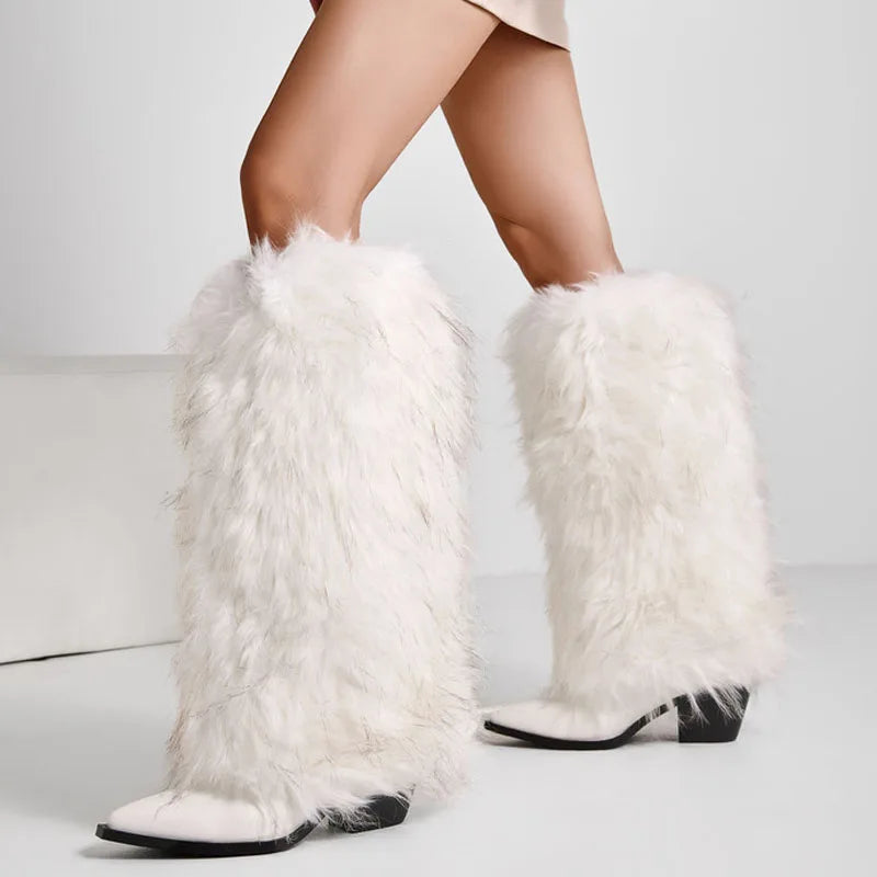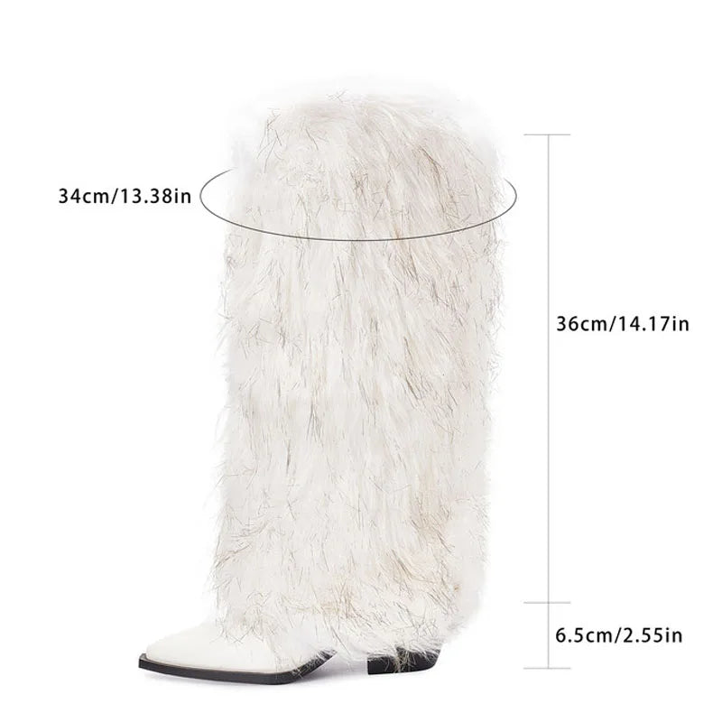 Step into bold style with the Trend4us Fluffy Plush Fur Chunky Knee-High Boots. Designed with ultra-soft faux fur and a statement chunky heel, these boots combine cozy texture with modern cowgirl flair. The pointed toe and sturdy sole offer both elegance and edge — perfect for winter fashion or standout streetwear looks.