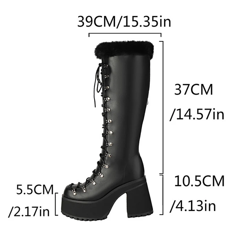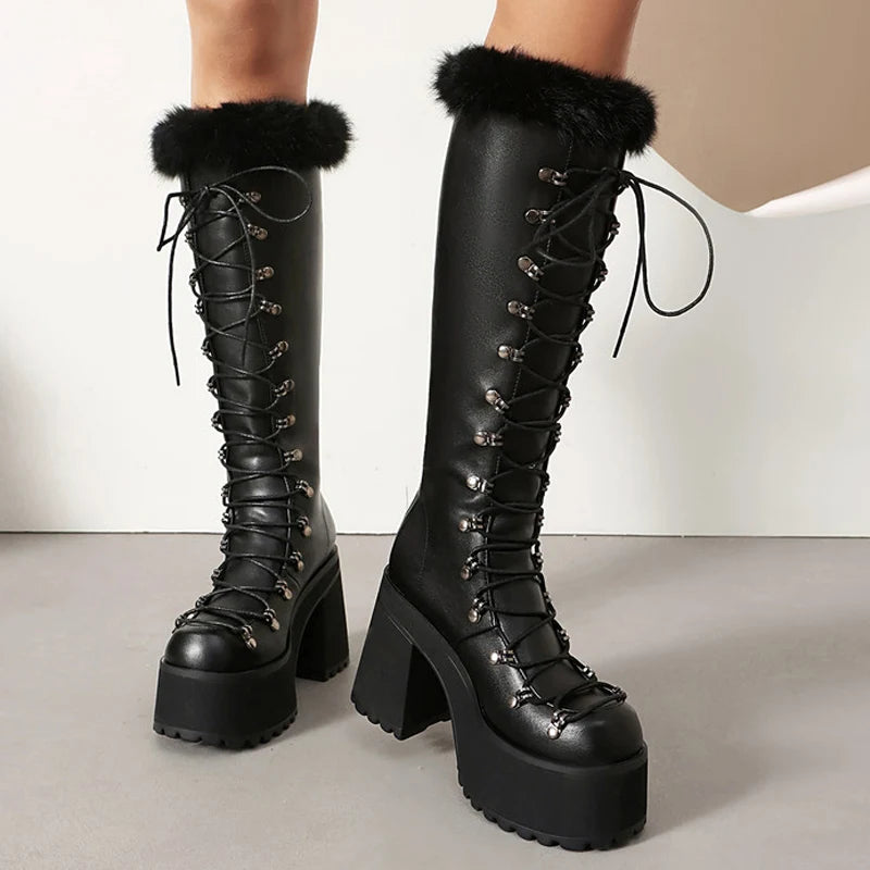 Step into bold winter glamour with the Trend4us Luxe Faux Fur Lace-Up Knee-High Boots. Designed for fashion lovers who crave both style and comfort, these statement boots feature a sleek faux leather finish with a plush faux fur trim for a touch of cozy elegance. The lace-up design with metal eyelets ensures an adjustable fit, while the chunky high platform sole provides height, stability, and a striking modern edge. Perfect for cold-weather outings, streetwear looks, and chic winter nights.