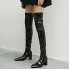 Command attention with the Trend4us Luxe Black Square-Toe Over-The-Knee Block Heel Boots, a statement of modern sophistication and timeless edge. Expertly crafted from supple faux leather, these boots feature a sleek over-the-knee silhouette designed to elongate your legs while offering structured comfort and support.
