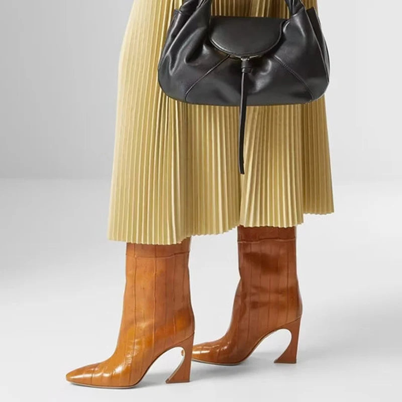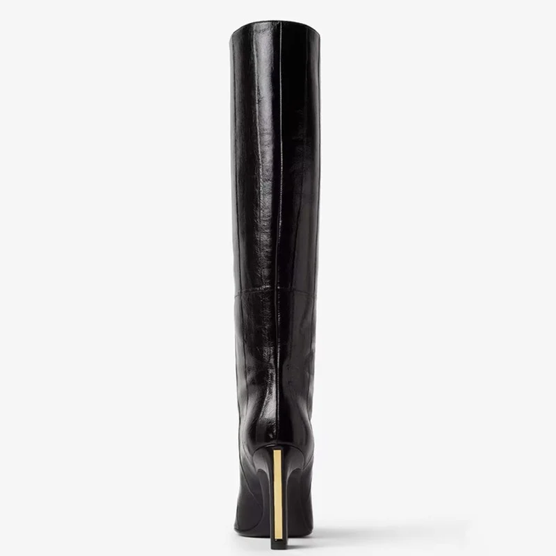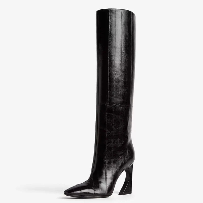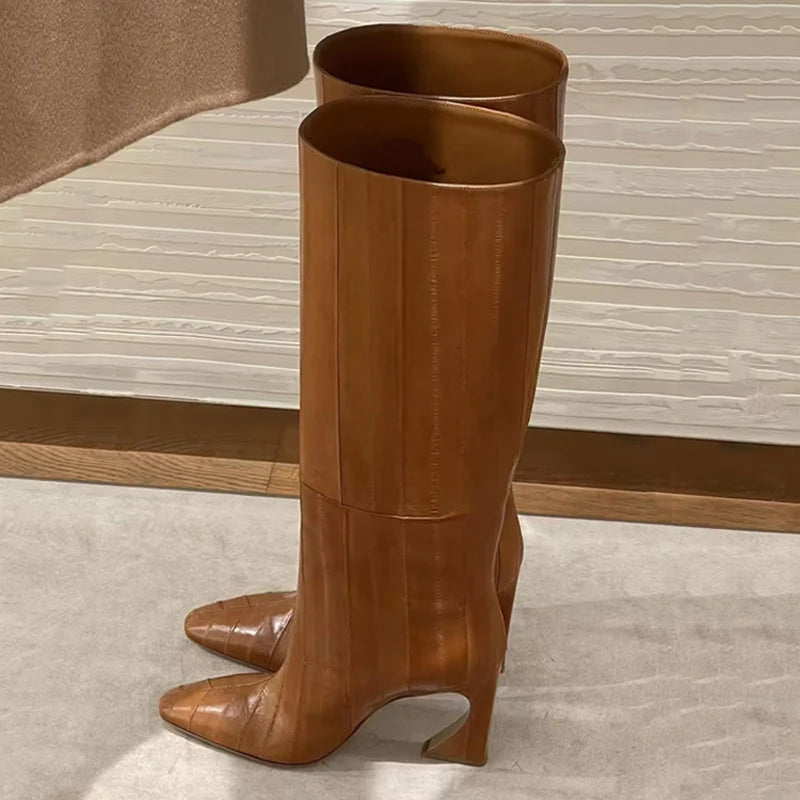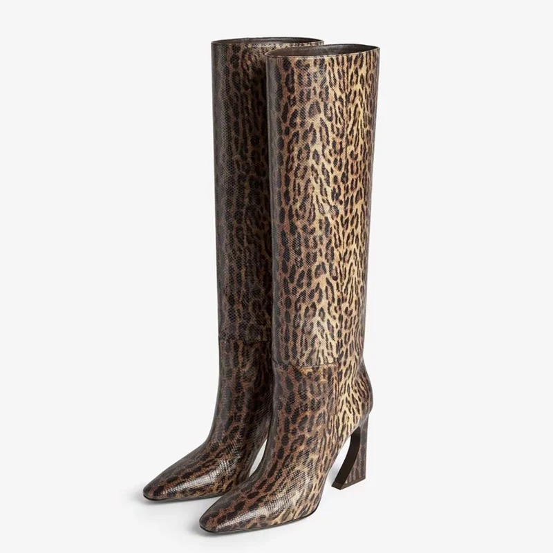Elevate your wardrobe with the Trend4us Luxe High-Heel Knee-High Boots, crafted for women who love bold sophistication. Featuring a sleek pointed toe and an artistic cutout stiletto heel, these boots bring together elegance and modern edge. Designed in premium faux leather with a glossy finish, they’re available in classic black, warm tan, and a daring leopard print. Perfect for styling with dresses, skirts, or skinny jeans, these boots are your go-to statement footwear for both day and night.