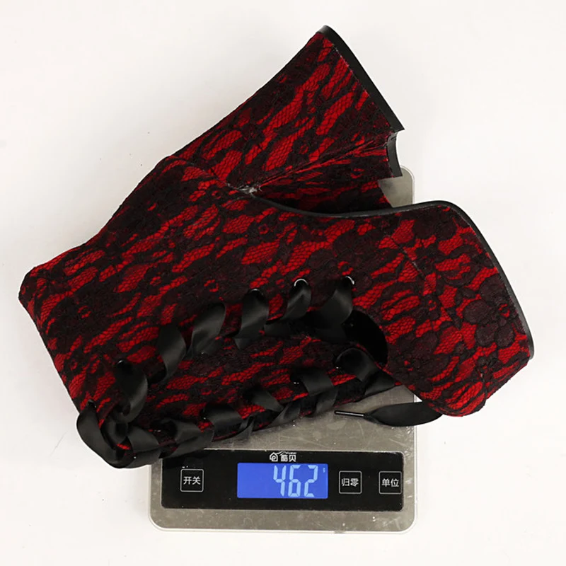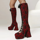 A chunky block heel and platform sole provide both height and stability, making them comfortable enough for day-to-night wear. Whether you choose the striking red-and-black lace pattern or the timeless all-black version, these boots are perfect for adding gothic glamour, vintage vibes, or festival flair to your wardrobe.