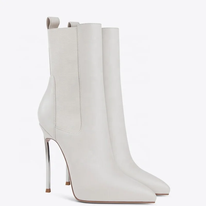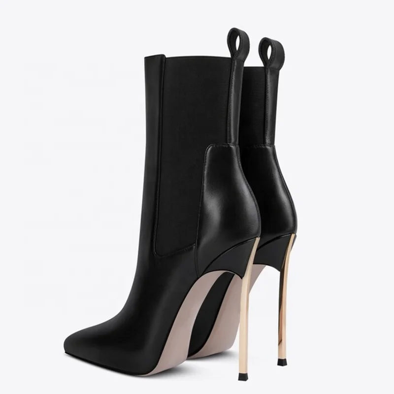 Crafted from premium faux leather with a smooth matte finish, these boots feature an ultra-sharp pointed toe and a sky-high metallic stiletto heel that elongates the leg and adds instant confidence to any look.