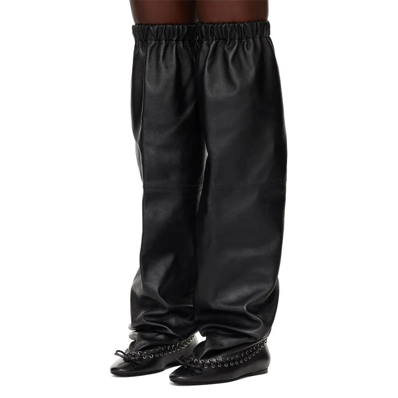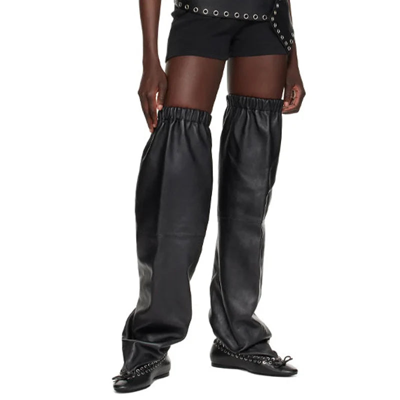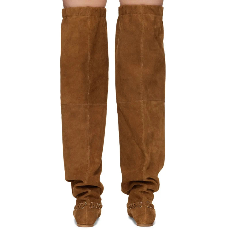 Step into bold, avant-garde style with the Trend4us Oversized Slouchy Over-The-Knee Boots. Featuring an exaggerated slouchy silhouette with elasticated cuffs for a secure yet dramatic fit, these boots redefine statement footwear. Available in black leather and brown suede, they merge streetwear edge with runway-inspired proportions. Finished with lace-trimmed detailing along the base and a comfortable flat sole, they’re perfect for fashion lovers who dare to stand out.