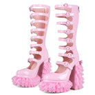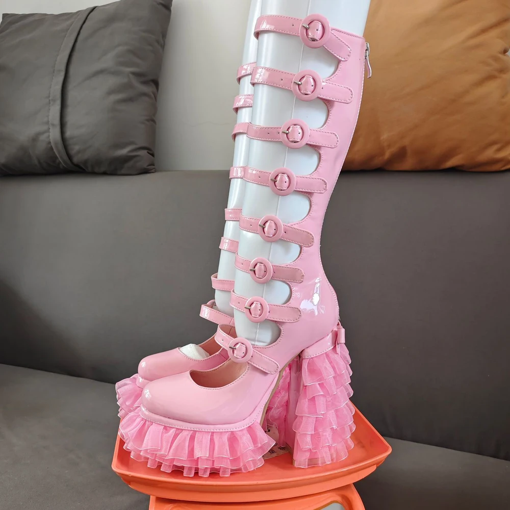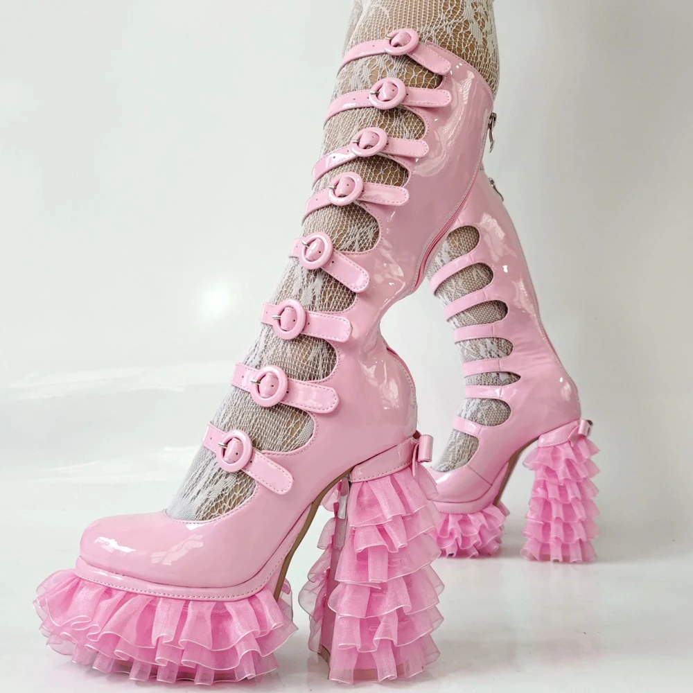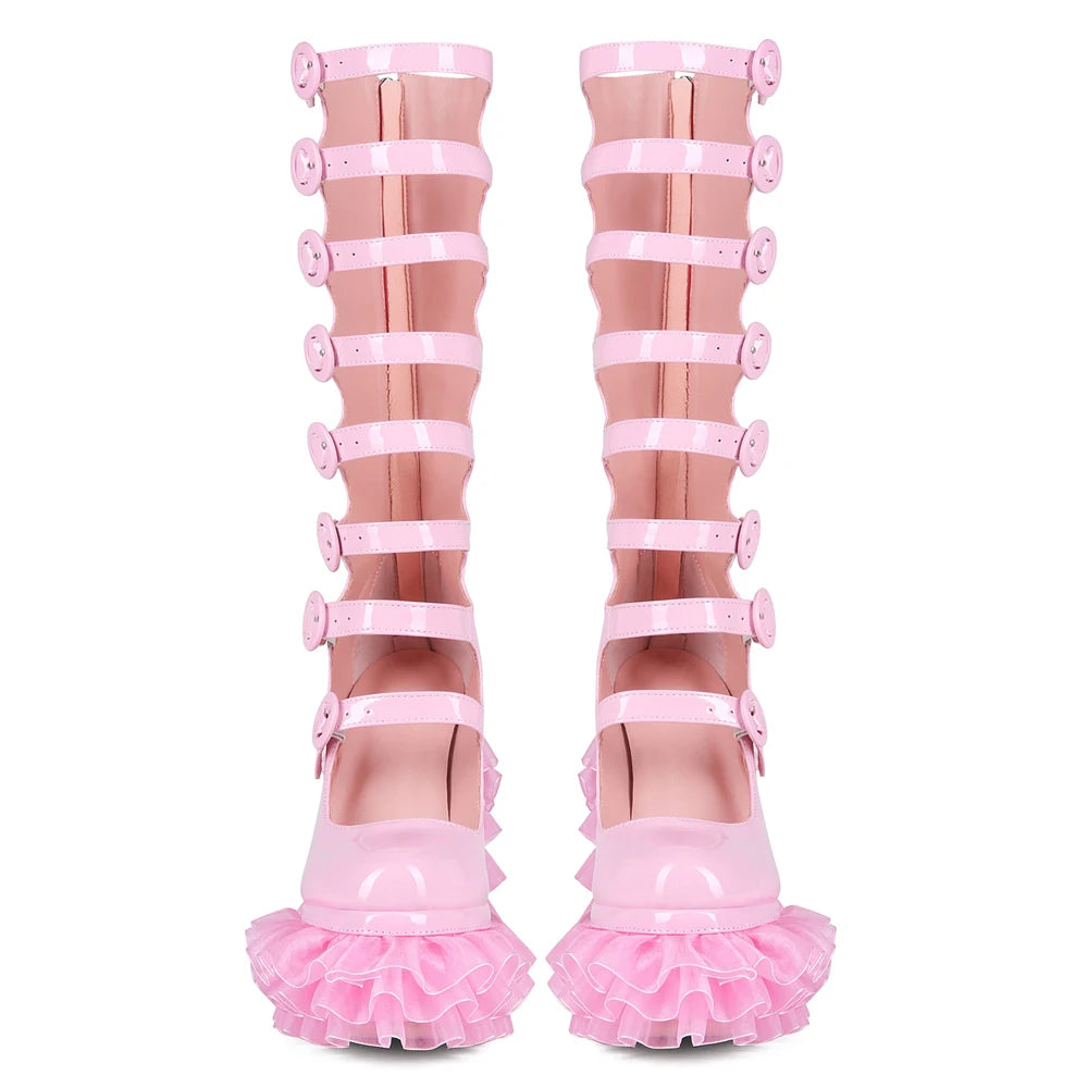 Make a daring statement with the Trend4us Pink Ruffled Platform Buckle Boots. Designed for bold fashion lovers, these avant-garde boots combine playful femininity with runway drama. Featuring a glossy pink patent finish, multiple front buckle straps, and voluminous layered ruffle details at the platform and heel, they’re the perfect fusion of fantasy and high-fashion. Ideal for parties, or editorial styling, these boots guarantee all eyes on you.