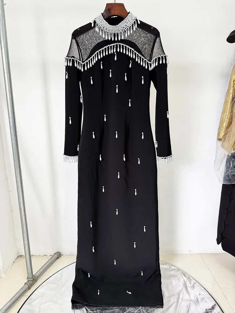 Trend4us Luxe Pearl-Studded Velvet High-Neck Gown