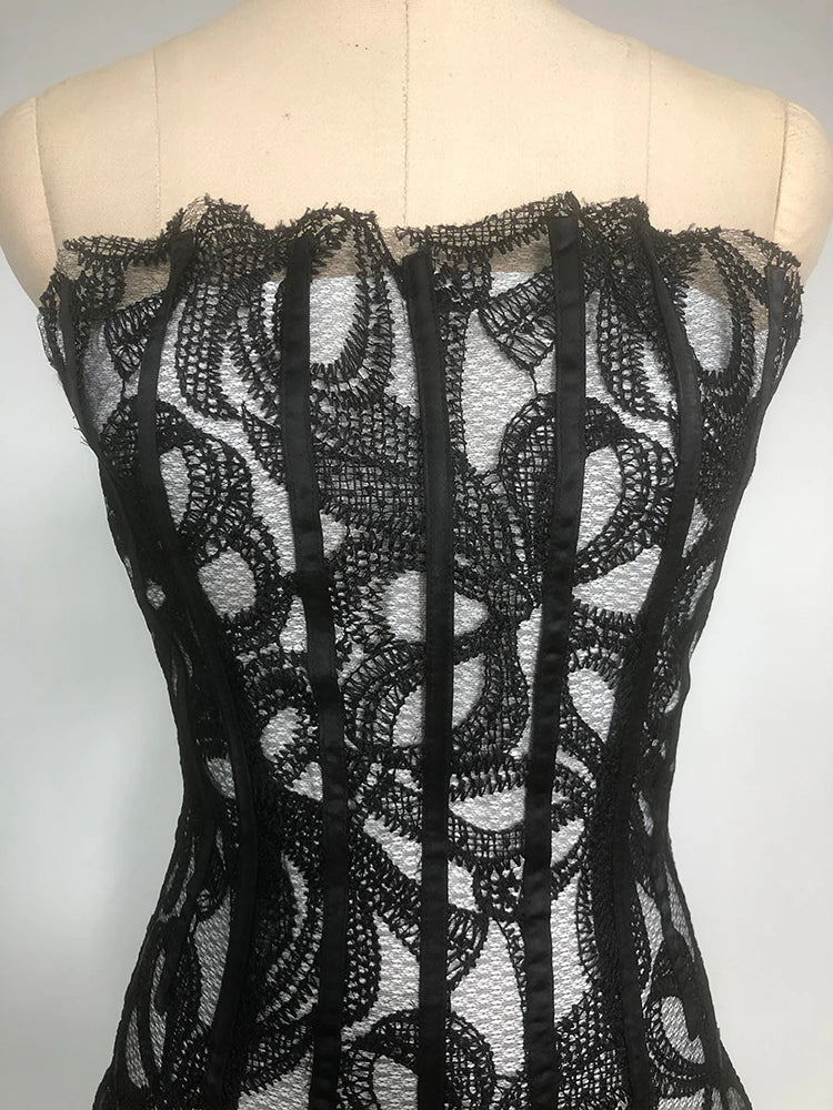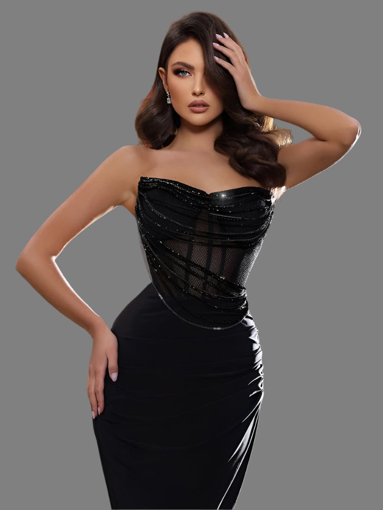 Trend4us Luxe Strapless Sheer Corset Beaded Velvet Gown