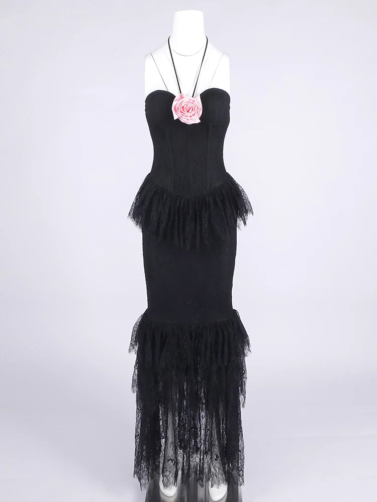 Trend4us Luxe Rose Appliqué Lace Tiered Mermaid Dress