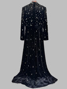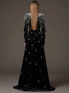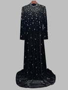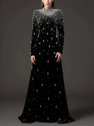 Make a striking entrance in the Trend4us Luxe Pearl-Studded Velvet High-Neck Gown, a breathtaking fusion of regal elegance and contemporary drama. Crafted from luxurious black velvet, this floor-length gown features a high neckline and long sleeves, offering a timeless silhouette with a modern edge.