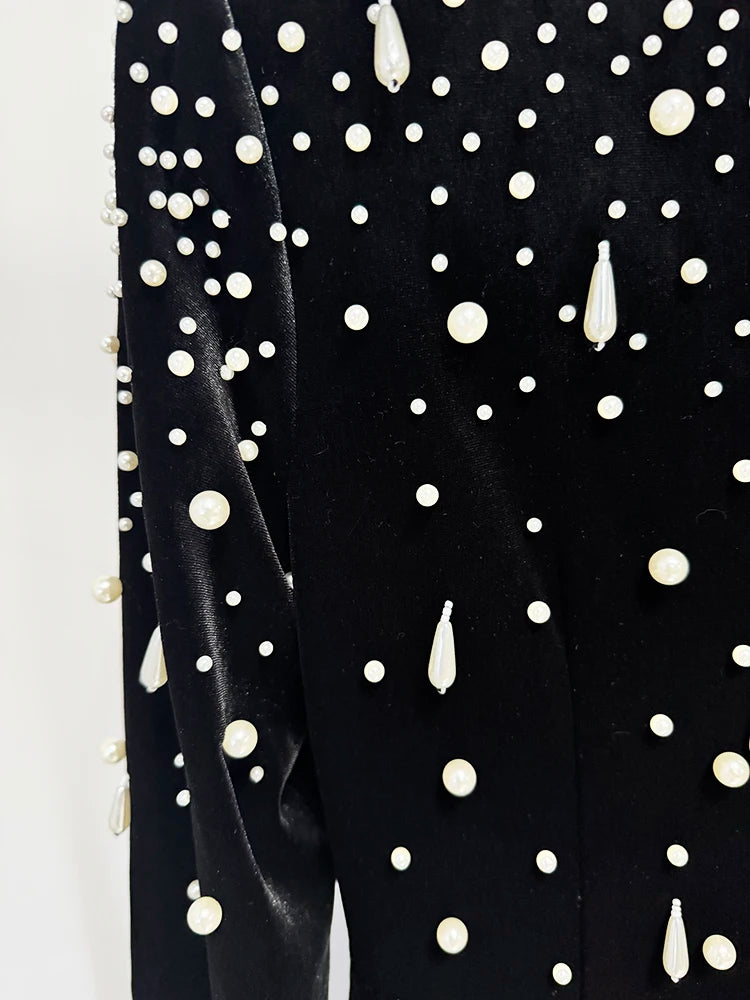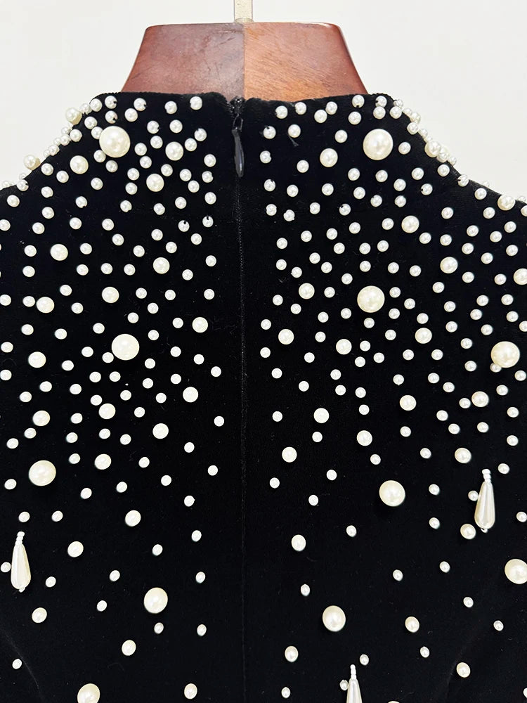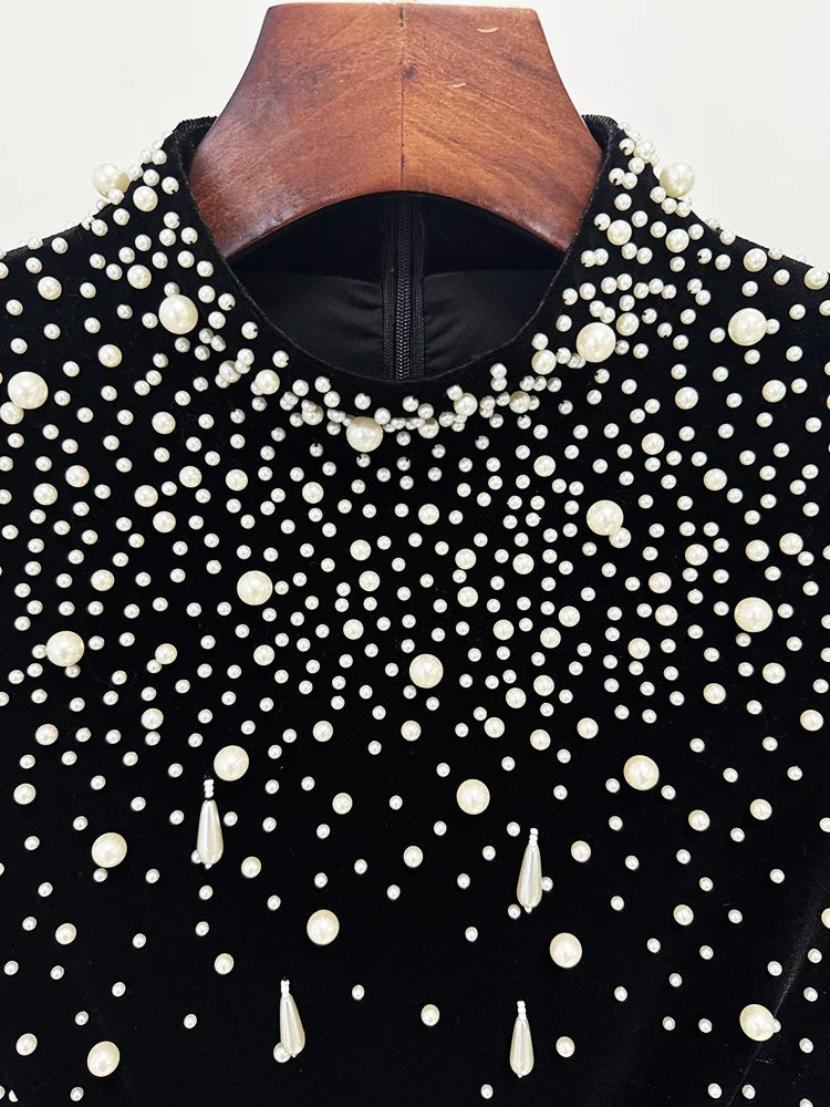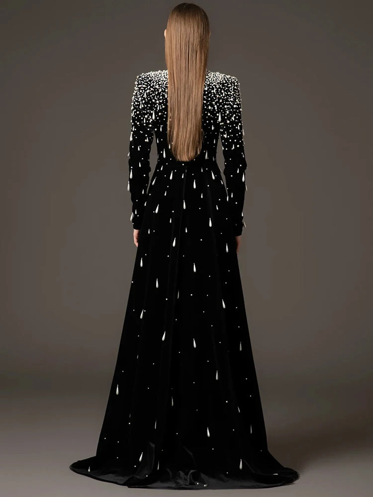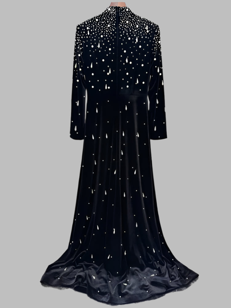 Trend4us Luxe Pearl-Studded Velvet High-Neck Gown
