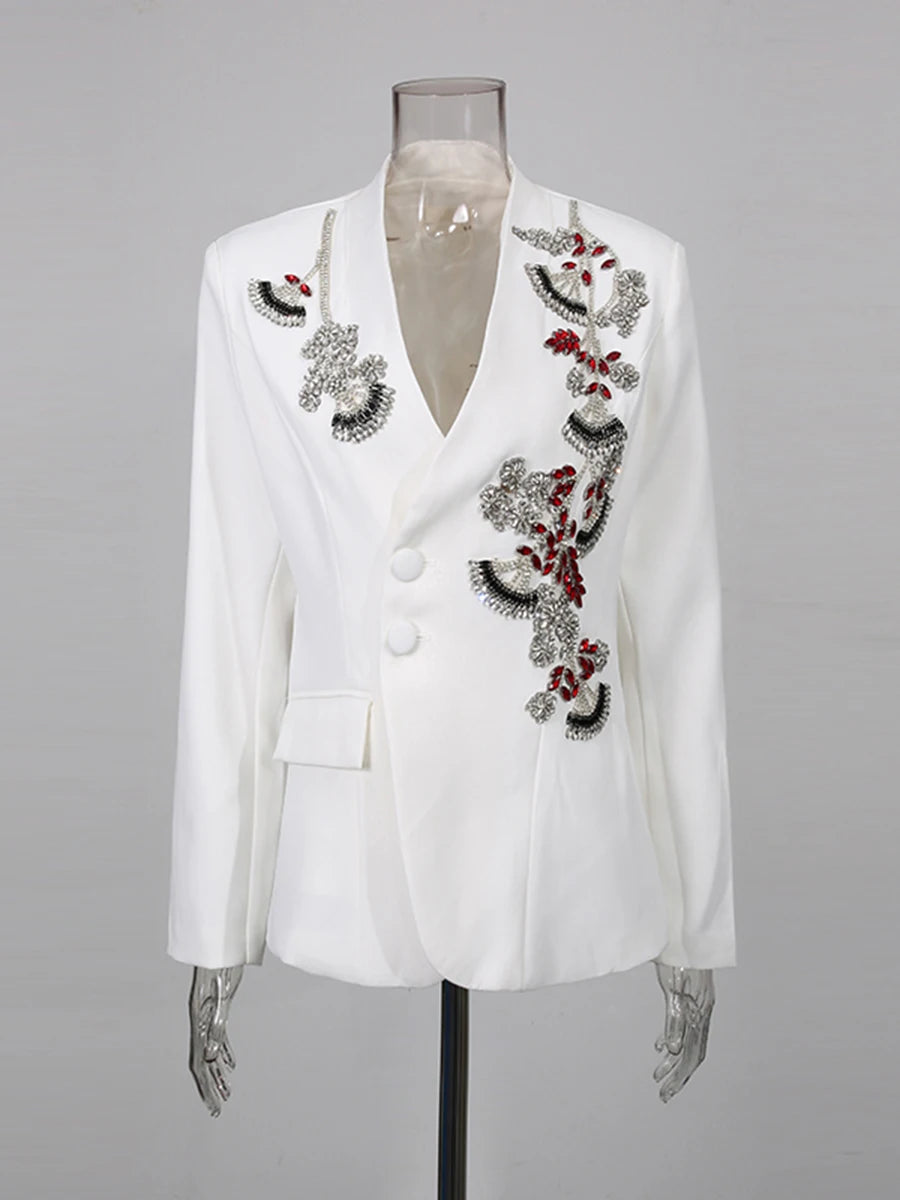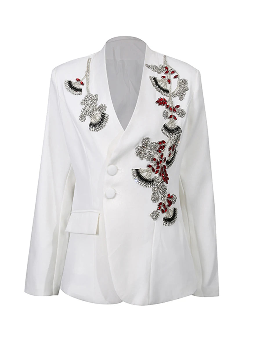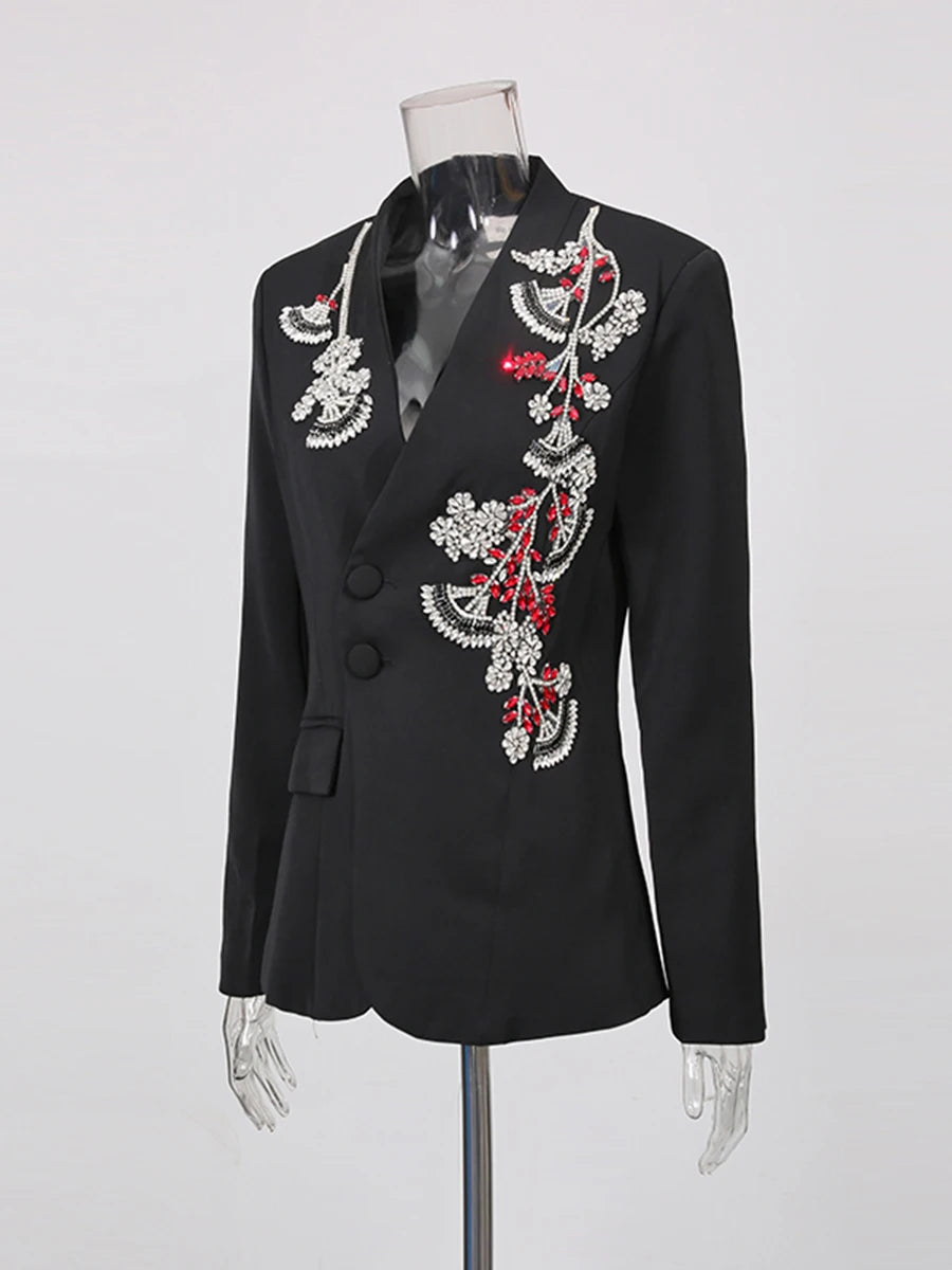 The highlight of this design lies in its hand-placed crystal, bead, and sequin embellishments, arranged in exquisite floral and fan-like patterns that cascade across the front for a luxurious shimmer effect. The contrast of silver and ruby red crystal detailing adds depth and sophistication, making this blazer ideal for high-end events, evening gatherings, and red-carpet occasions.