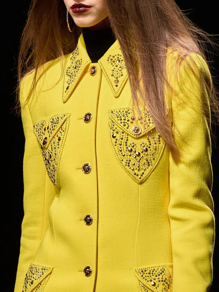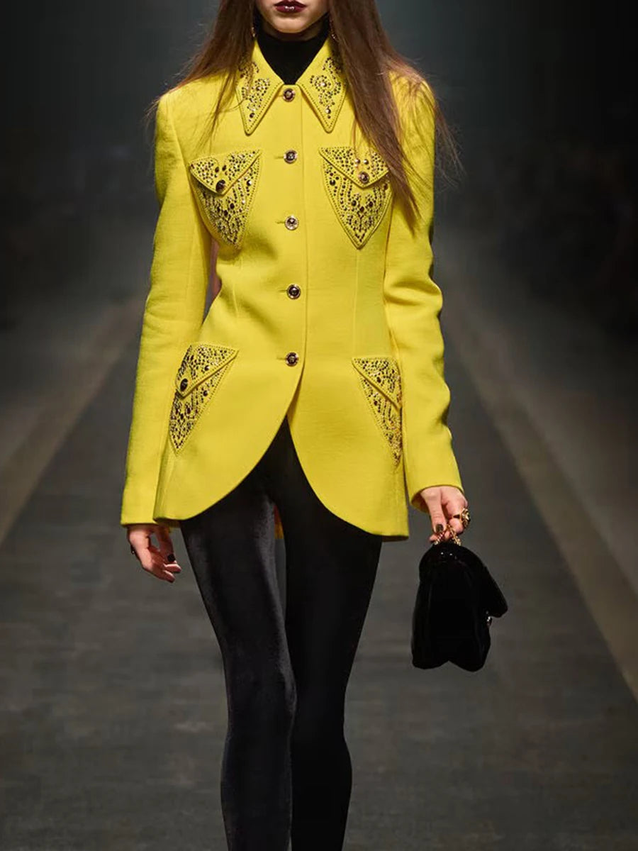 Command attention with the Trend4us Luxe Embellished Yellow Blazer, a radiant statement piece designed for bold sophistication. Crafted in a vibrant yellow hue, this tailored blazer features intricate beaded embellishments along the collar and pockets, adding an elevated touch of glamour. The structured silhouette with gold button closure exudes confidence and modern luxury, making it perfect for high-fashion moments, parties, or upscale events. Pair it with sleek trousers, skirts, or wear it as a standalone standout piece.