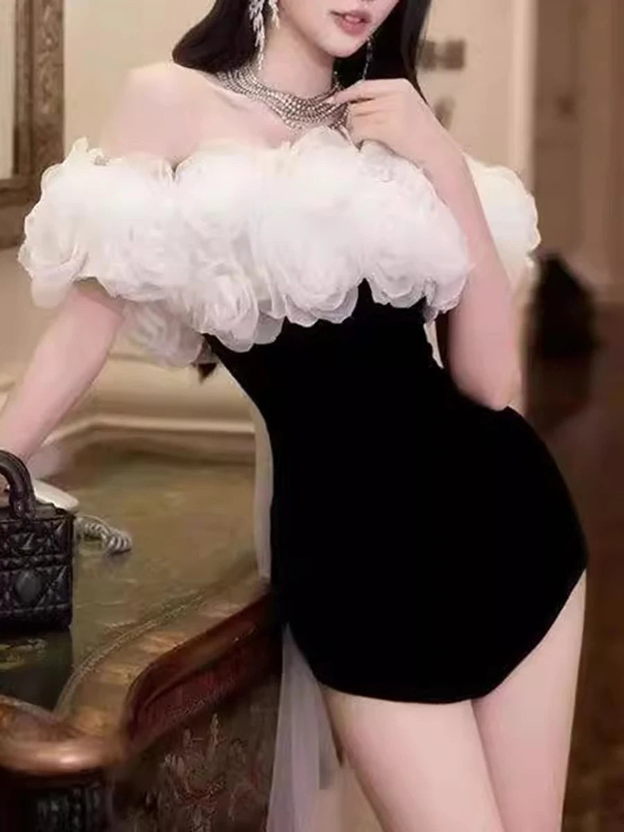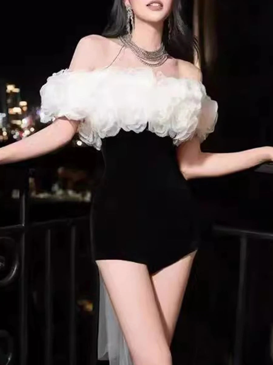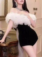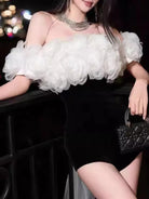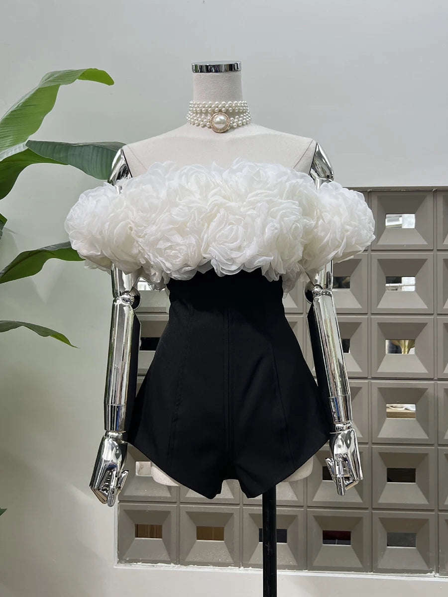 Step into luxury with the Trend4us Luxe 3D Flower Off-Shoulder Romper Two-Piece Set. Designed for the modern woman who loves elegance with a bold edge, this statement piece features a detachable 3D floral ruffle overlay paired with a sleek, figure-hugging black romper.