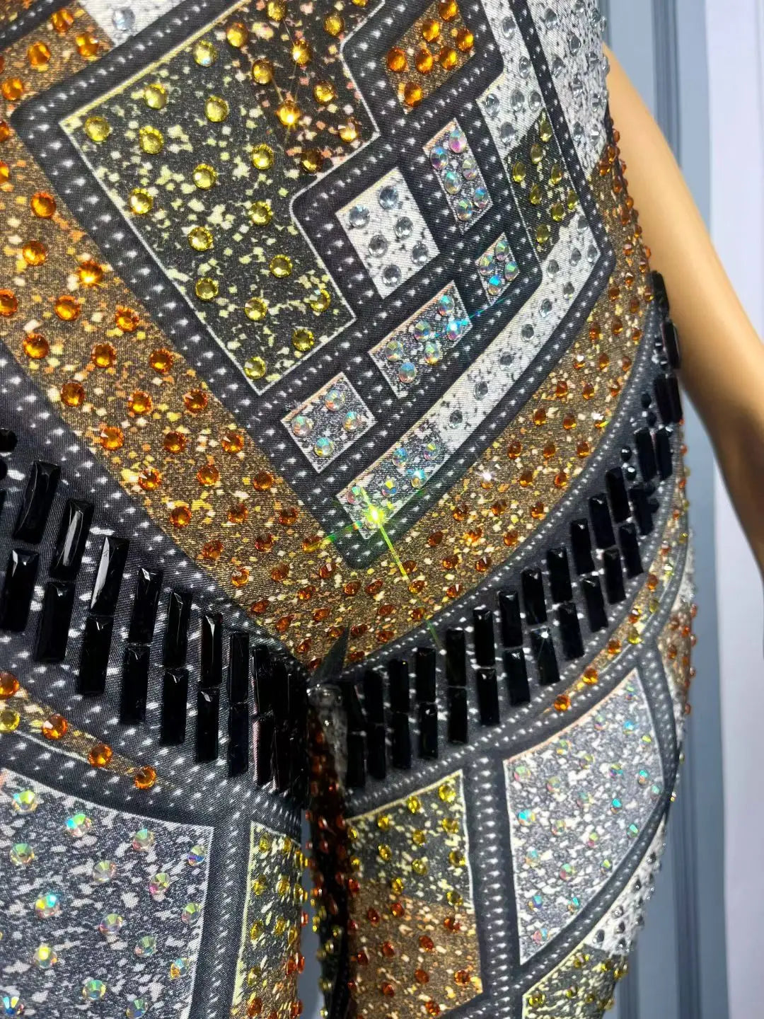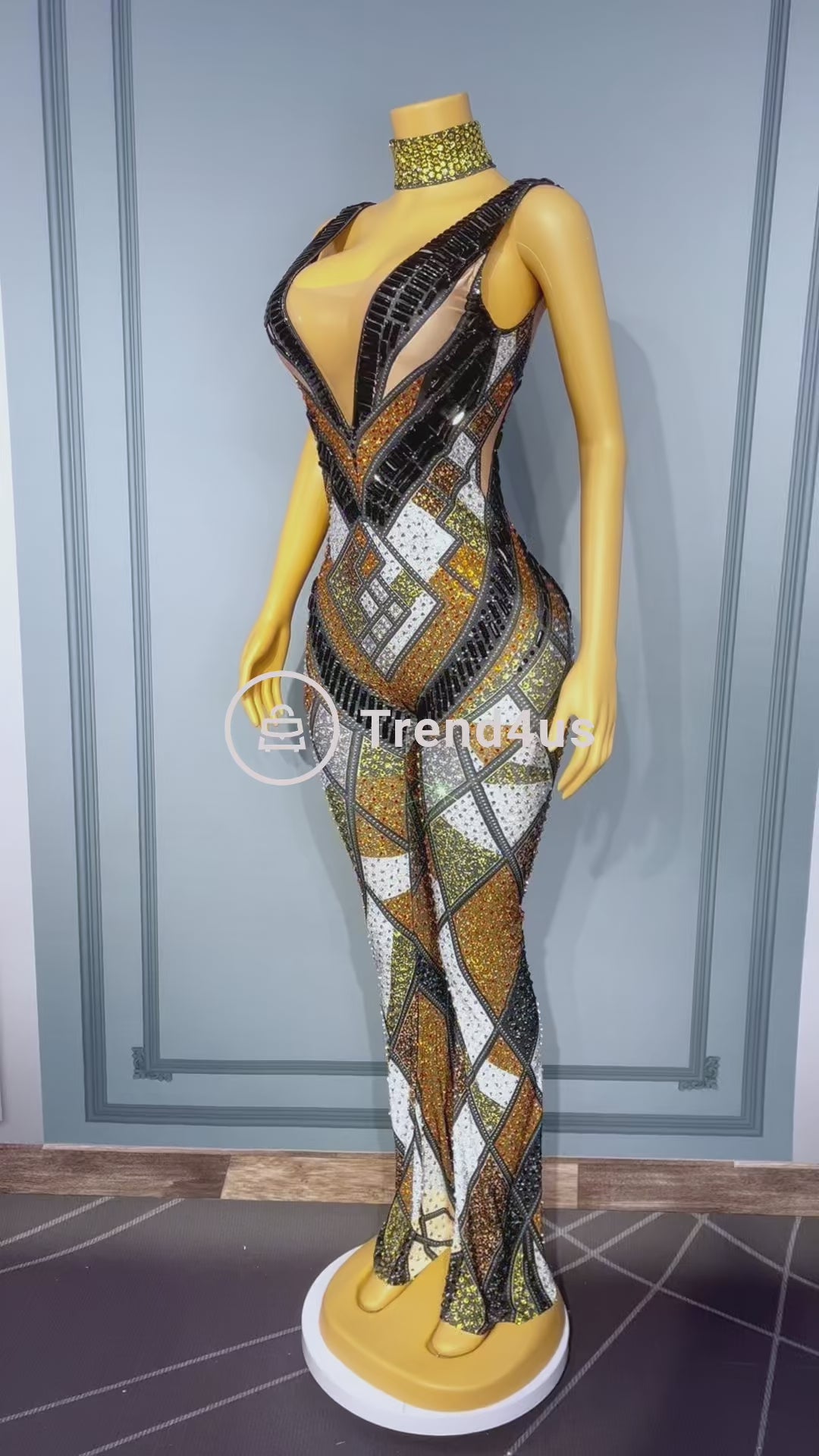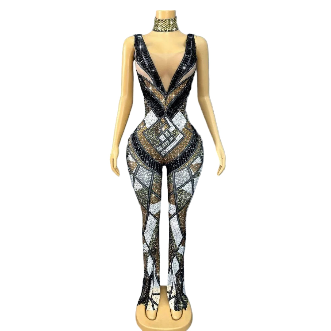 Command attention with the Trend4us Luxe Geometric Crystal Mesh Jumpsuit, a statement piece designed for those who dare to shine. This breathtaking one-piece features a figure-sculpting silhouette with strategically placed geometric crystal patterns that create a dazzling hourglass illusion.