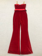 The high-waisted design with a matching velvet belt cinches your waist, creating a flattering silhouette, while the flared pant legs elongate your frame for a sleek, sophisticated look. Whether you’re attending a glamorous event, cocktail party, or an upscale dinner, this jumpsuit is your ultimate go-to outfit for a refined yet bold fashion statement.