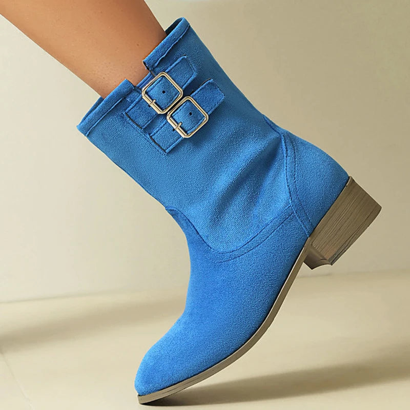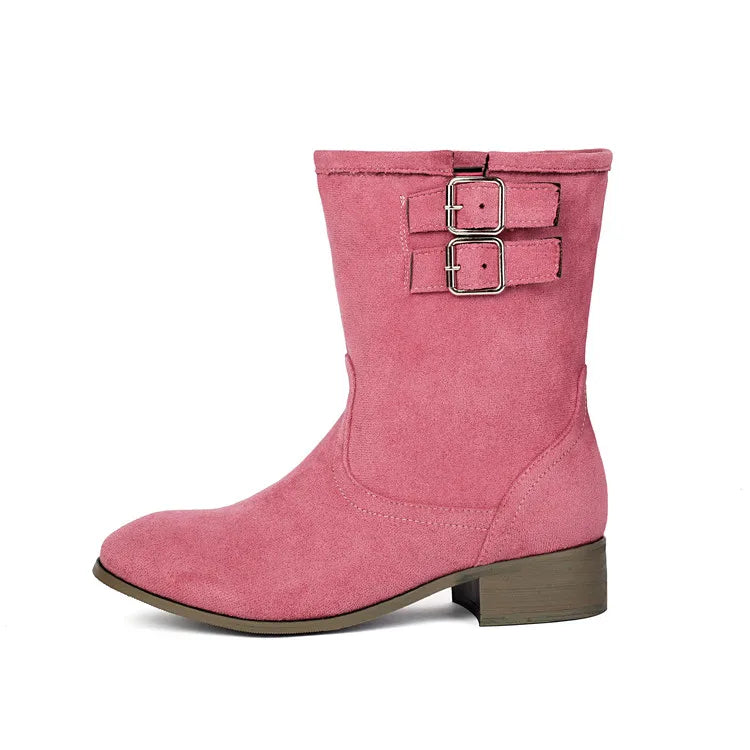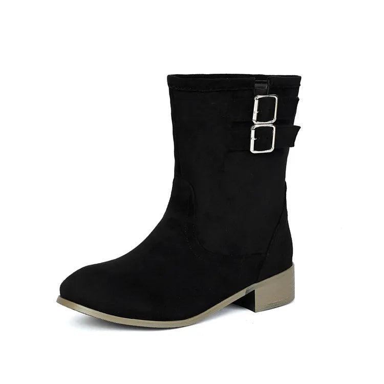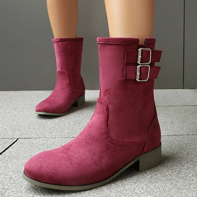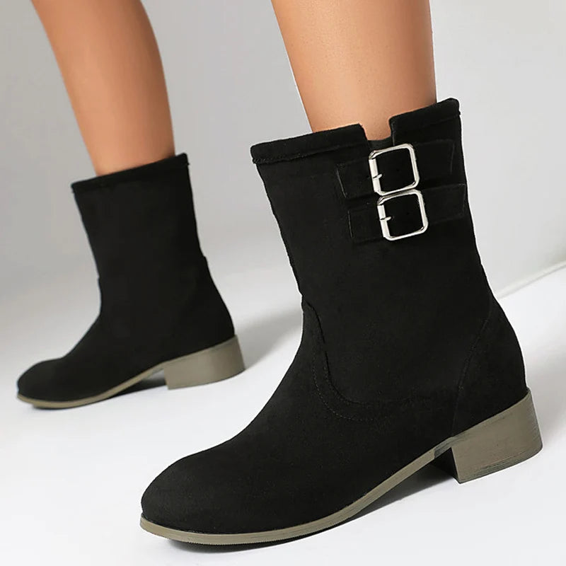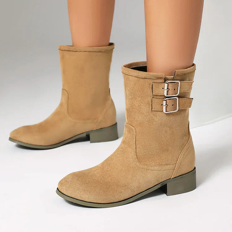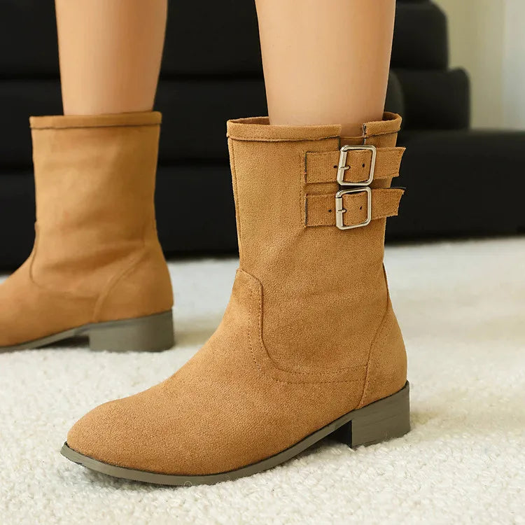 Trend4us Suede Double-Buckle Mid-Calf Boots
