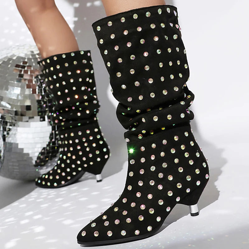 Trend4us Rhinestone Studded Slouchy Mid-Heel Boots