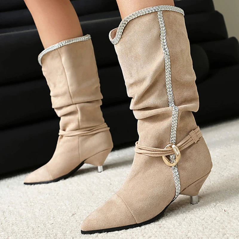 Trend4us Buckle Strap Suede Stiletto Mid-Calf Boots