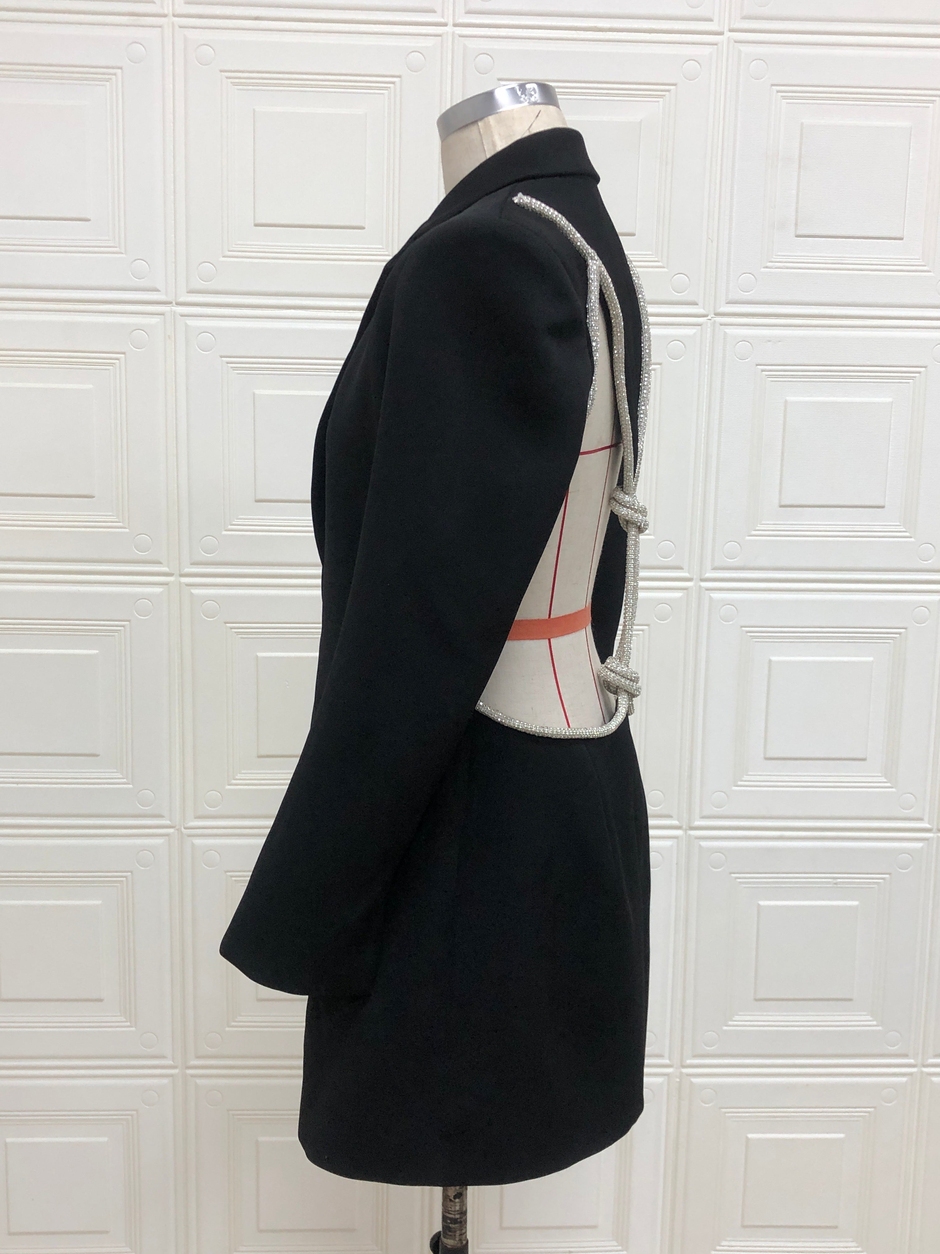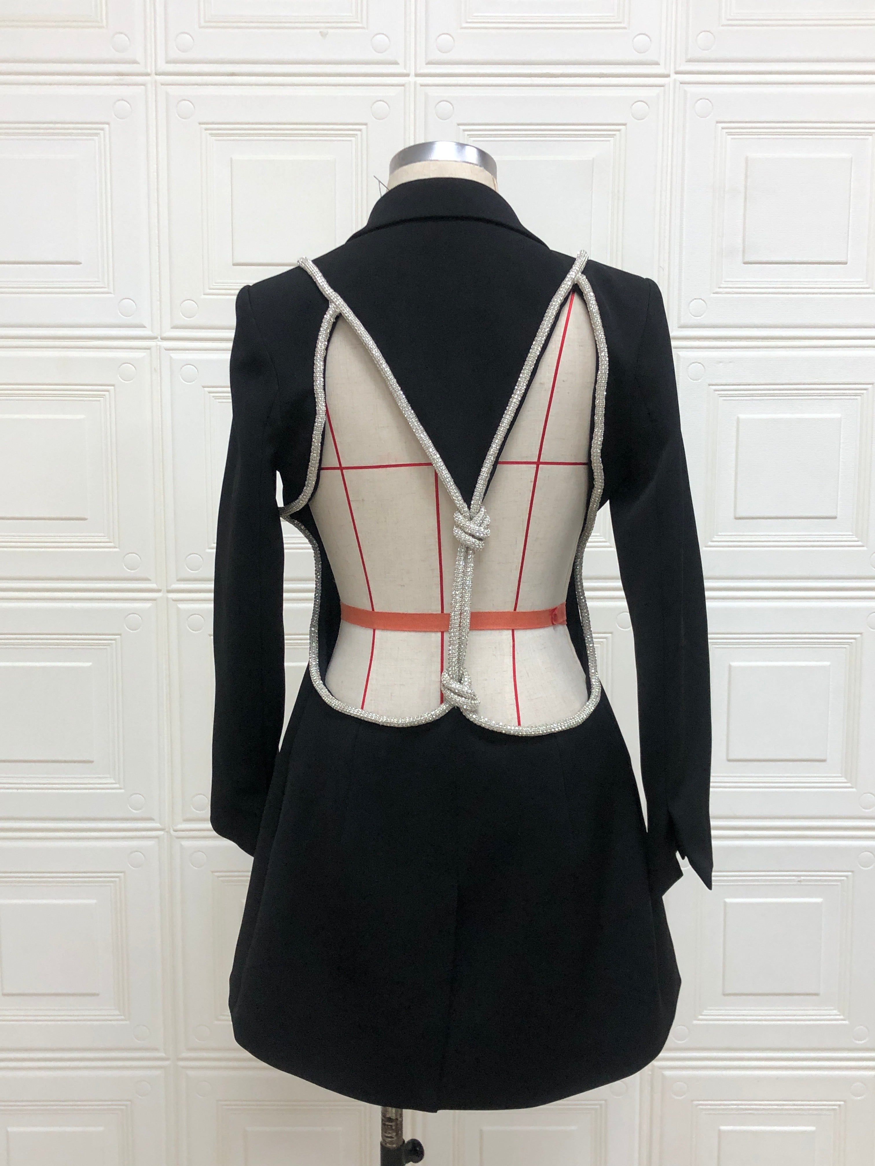 Turn heads with the Trend4us Women’s Backless Blazer Dress, a bold fusion of sophistication and glamour. This sleek blazer dress features a tailored front with sharp lapels and a structured fit, while the dramatic open-back design is adorned with sparkling rhinestone embellishments for a striking touch. Perfect for making a statement at formal events, parties, or upscale gatherings.