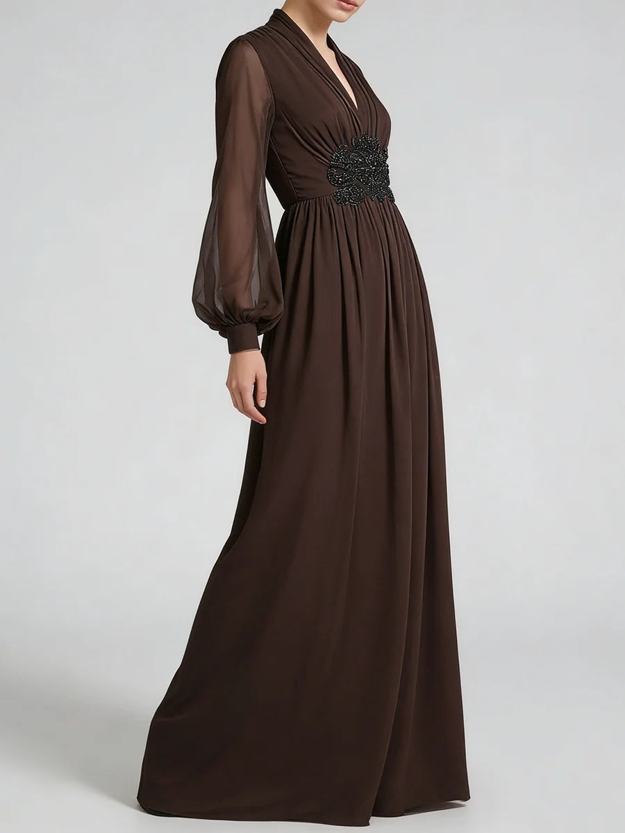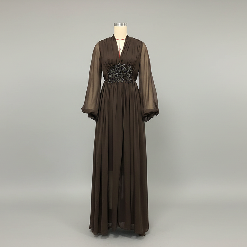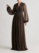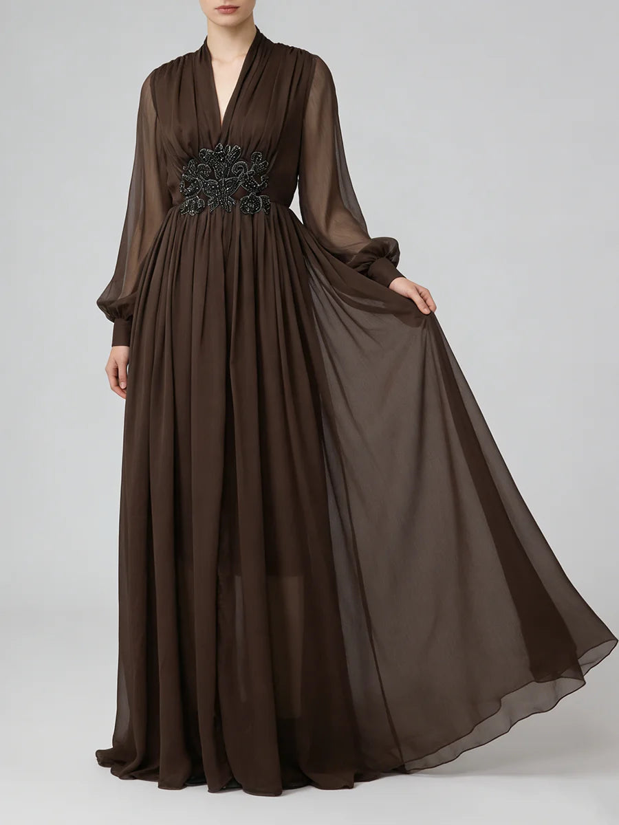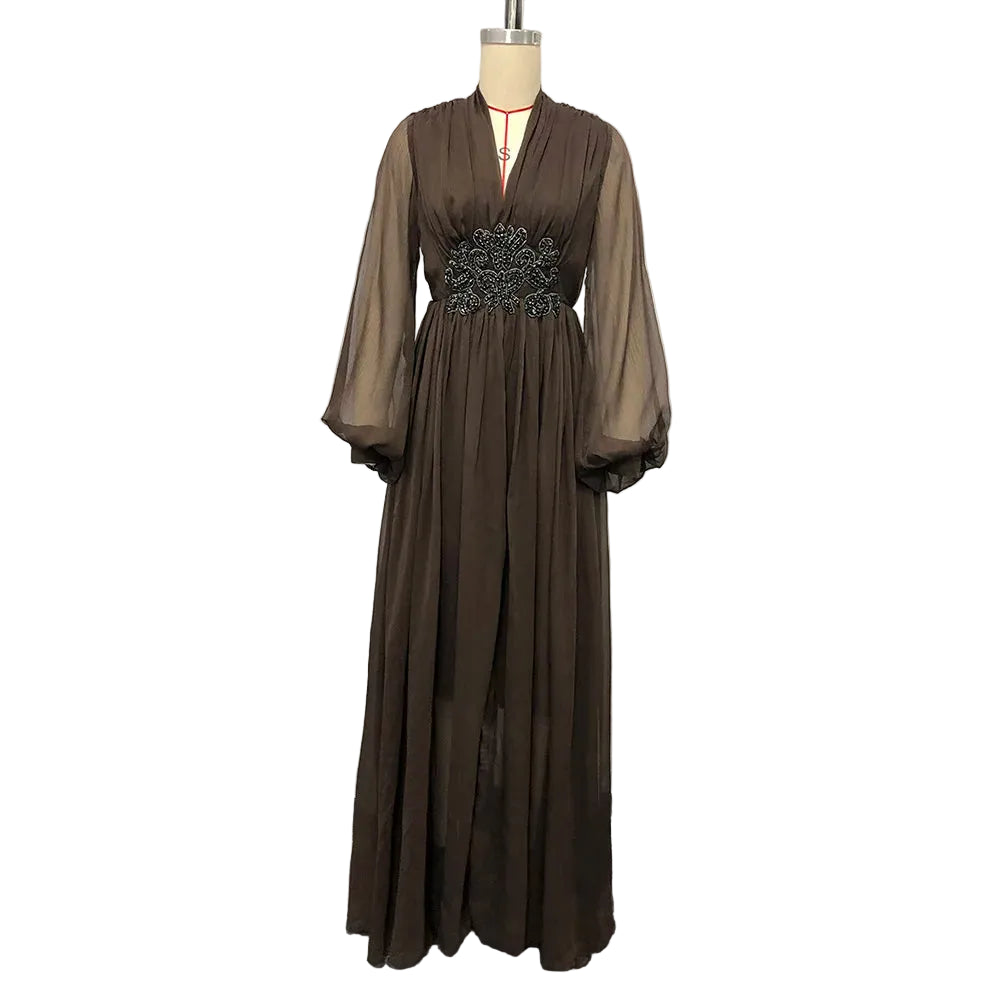 Make a statement in this exquisite beaded waist chiffon maxi dress. The delicate sheer lantern sleeves add romantic elegance, while intricate beading at the empire waist creates a flattering focal point that enhances your silhouette.