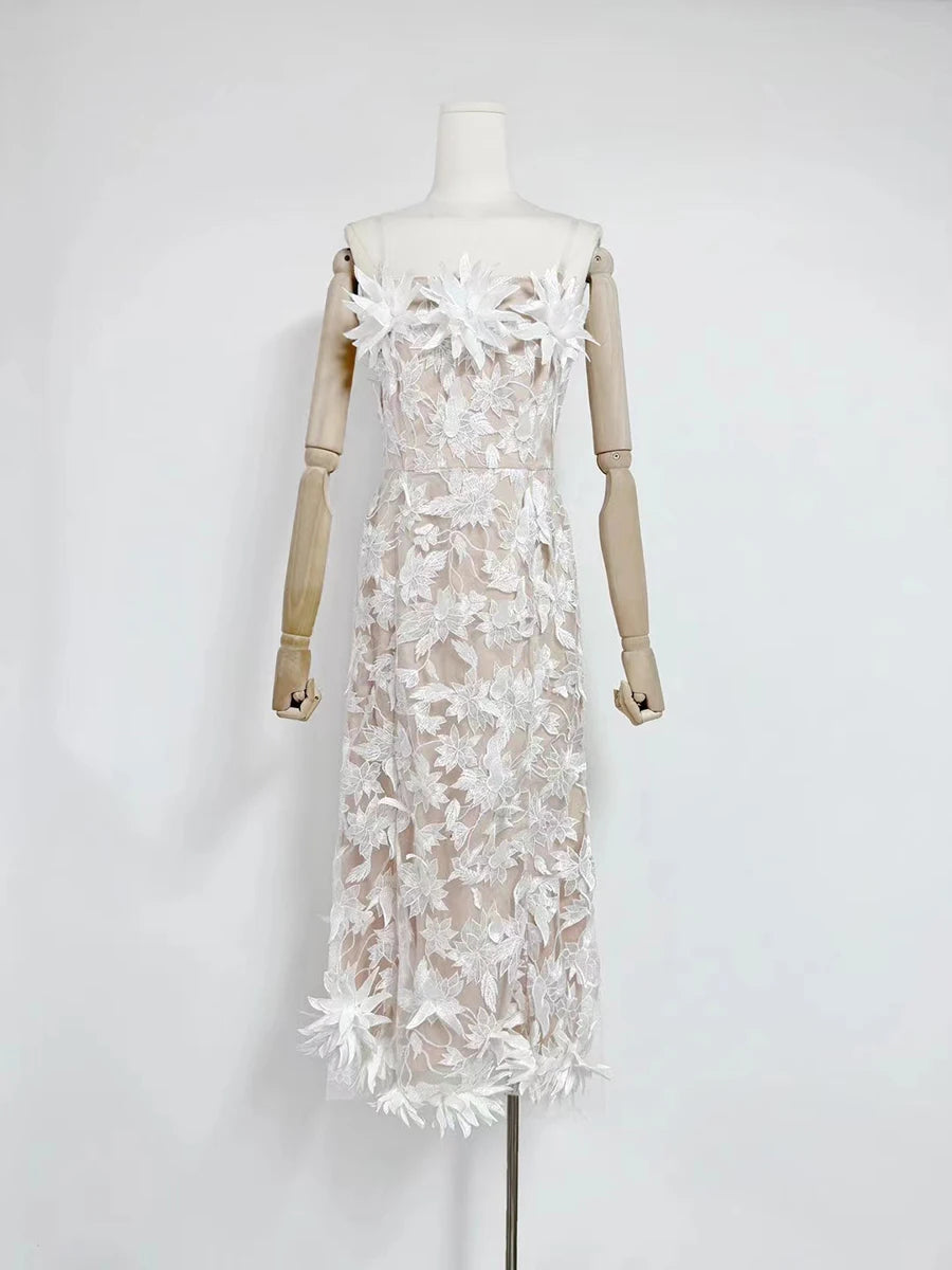 The strapless neckline is artfully framed with oversized floral embellishments that add dramatic texture and couture appeal. A fitted bodice flows into a graceful A-line midi skirt, subtly flaring at the hem with a flourishing border of dimensional petals. Ideal for spring galas, outdoor weddings, and fashion-forward soirées, this piece exudes luxury and high-art fashion sensibility.