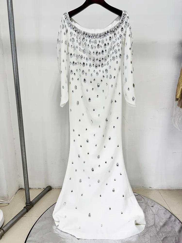 Make a breathtaking entrance in the Trend4us Luxe Crystal Embellished Off-Shoulder Gown. This exquisite floor-length gown features a stunning off-shoulder neckline that gracefully frames the décolletage, while the slim-fit silhouette accentuates your curves. Adorned with glistening oversized crystal embellishments from top to bottom, the dress radiates pure luxury and glamour. Long sleeves with a refined slit cuff add a modern edge, perfect for upscale galas, red carpet events, or unforgettable evening soirées.