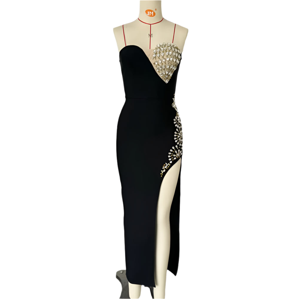 Dazzle in the Trend4us Luxe Strapless Crystal Embellished Slit Gown—a breathtaking piece crafted for glamorous evenings. This form-fitting black gown features a sculpted strapless neckline adorned with glistening crystal embellishments that cascade down the bodice. A dramatic thigh-high slit, accentuated with intricate rhinestone detailing, adds allure and sophistication. Designed with a back zipper for a seamless fit, this gown is the epitome of elegance and bold femininity—perfect for galas, red carpet events, and formal celebrations.