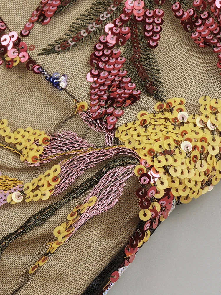 - Sheer nude mesh overlay with multicolor sequin floral embroidery