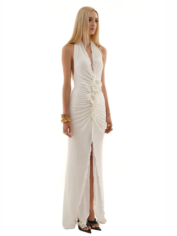 Trend4us Elegant Backless Halter Ruched Rosette Slit Gown