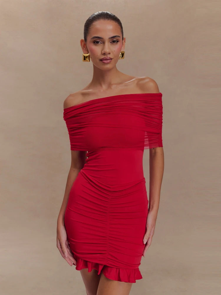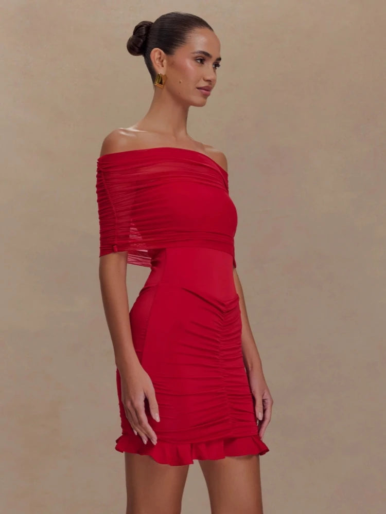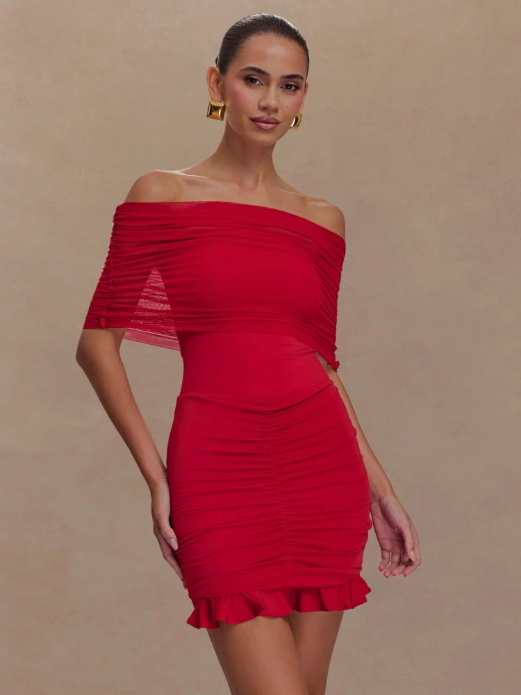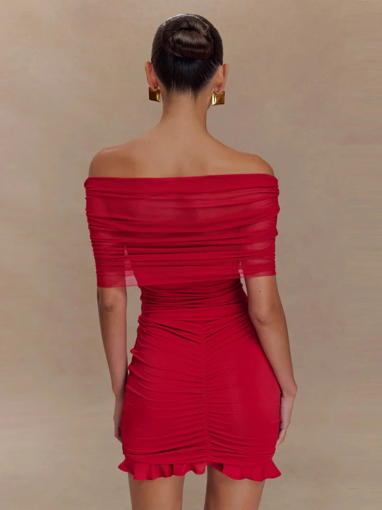 Trend4us Mesh Ruched Off-Shoulder Ruffle Mini Dress